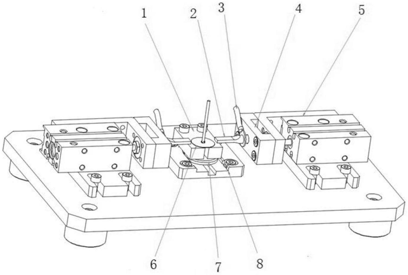 本实用新型公开一种焊接装置,用于锂电池烧结盖与定位片的焊接;所述焊接装置包括上放置台、焊针、焊机导线、焊针座、气缸组件、下放置台;上放置台固定在下放置台上,上放置台设置卡住烧结盖竖直杆的凹槽,下放置台设置容纳烧结盖圆形底片的凹槽;上放置台及下放置台两侧分别设置有焊针座,焊针座上的焊针指向上放置台及下放置台,焊针座连接有气缸组件,焊针连接焊接导线;将烧结盖通过上放置台及下放置台固定,定位片套在烧结盖的竖直杆上;气缸组件推动焊针移动至焊接位置时,焊针放电形成闭路,焊机带动焊针将定位片焊接在烧结盖上。
