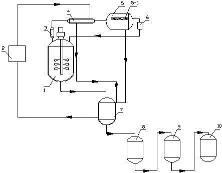 本实用新型提出了一种树脂反应釜系统,包括反应釜、卧式分离器、兑稀釜、储存罐,所述反应釜顶部气体出口与竖式冷凝器相连,竖式冷凝器与卧式分离器通过卧式冷凝器相连;所述卧式分离器内设有聚结滤芯,卧式分离器中的回流液通过干燥剂盒回流至反应釜内,卧式分离器的废水出口与兑稀釜夹套进水口相连,兑稀釜夹套出水口通过冷却塔连通卧式冷凝器的进水口,卧式冷凝器的出水口通过管道与兑稀釜夹套进水口相连,兑稀釜的出料口与搅拌釜进料口连接,搅拌釜与储存罐之间设有过滤机。整个树脂反应釜系统能够充分利用废水,循环使用冷却水,无废水排放,且物料纯度高。