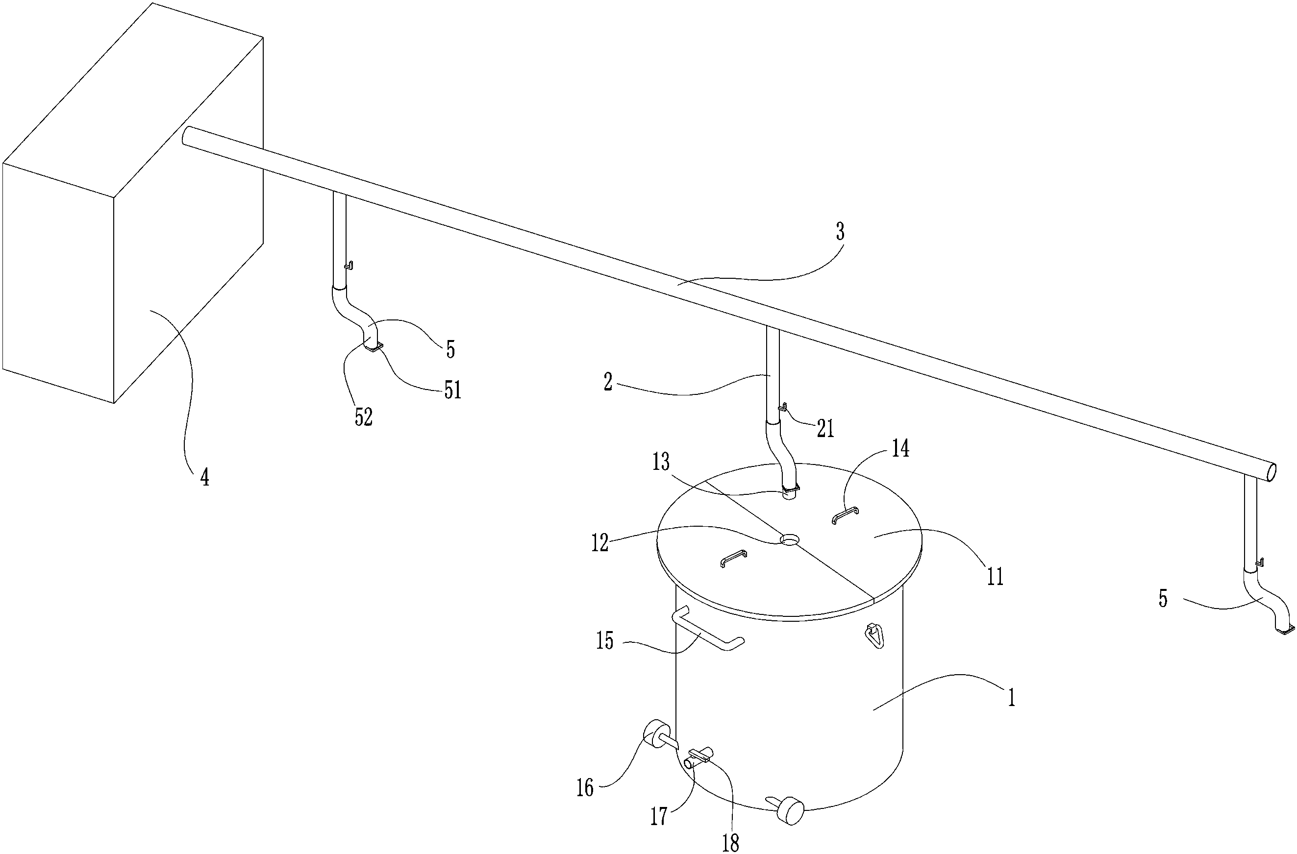 本实用新型公开了油漆生产设备技术领域的一种油漆生产线用密闭式废气收集处理装置,旨在解决油漆搅拌时会向车间发散出挥发性气体的技术问题,包括:净化空调器;以及与所述净化空调器连通的横向主管道,所述横向主管道上连通有至少一条纵向次管道,所述纵向次管道的一端连通有软管;搅拌桶,所述搅拌桶顶部设有两个半圆形的桶盖,所述桶盖圆心处设有一半圆凹槽,以使两桶盖拼合成一完整的圆形桶盖后,圆心位置为一圆孔;所述桶盖上连通有排气管,所述软管的自由端套接于所述排气管上。本实用新型结构简单,操作方便,通过与搅拌桶转动连接的两个半圆形桶盖实现了搅拌桶顶部的密封,通过管道将油漆搅拌时散发出的挥发性气体吸入净化空调器进行处理。