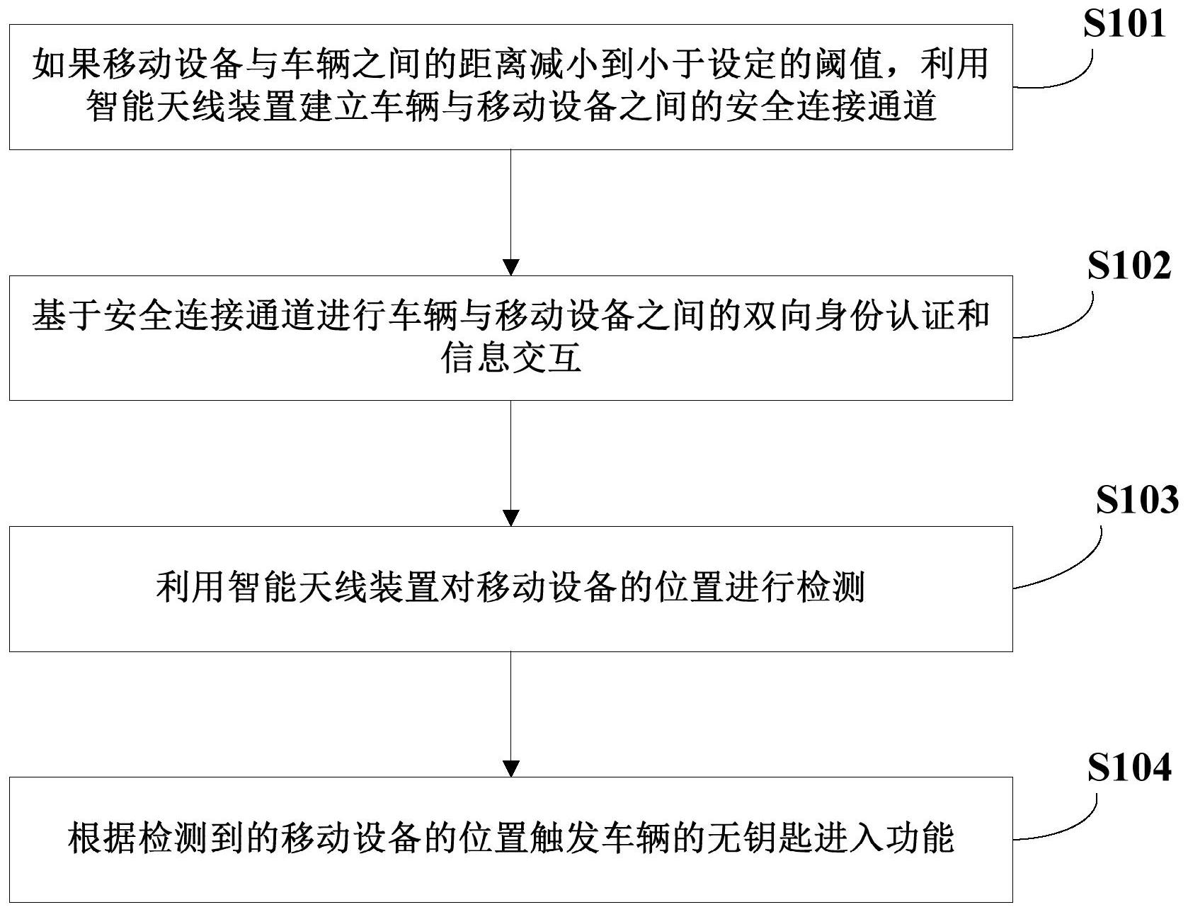 本发明公开了一种利用智能天线装置实现车辆的无钥匙进入功能的方法,智能天线装置中集成有支持WiFi、BLE和移动通信天线,所述方法包括:如果移动设备检测到其与车辆之间的距离减小到小于设定的阈值,利用所述智能天线装置建立车辆与移动设备之间的安全连接通道;基于安全连接通道进行车辆与移动设备之间的双向身份认证,在认证通过之后,利用智能天线装置对移动设备的位置进行检测;根据检测到的移动设备的位置触发车辆的无钥匙进入功能。本发明中,通过利用车载的智能天线装置实现双向身份认证和检测移动设备的位置,以满足对传输数据进行较高等级加密的要求,并且无需额外的车载计算机节点,减少了硬件和布线以及安装的开销。