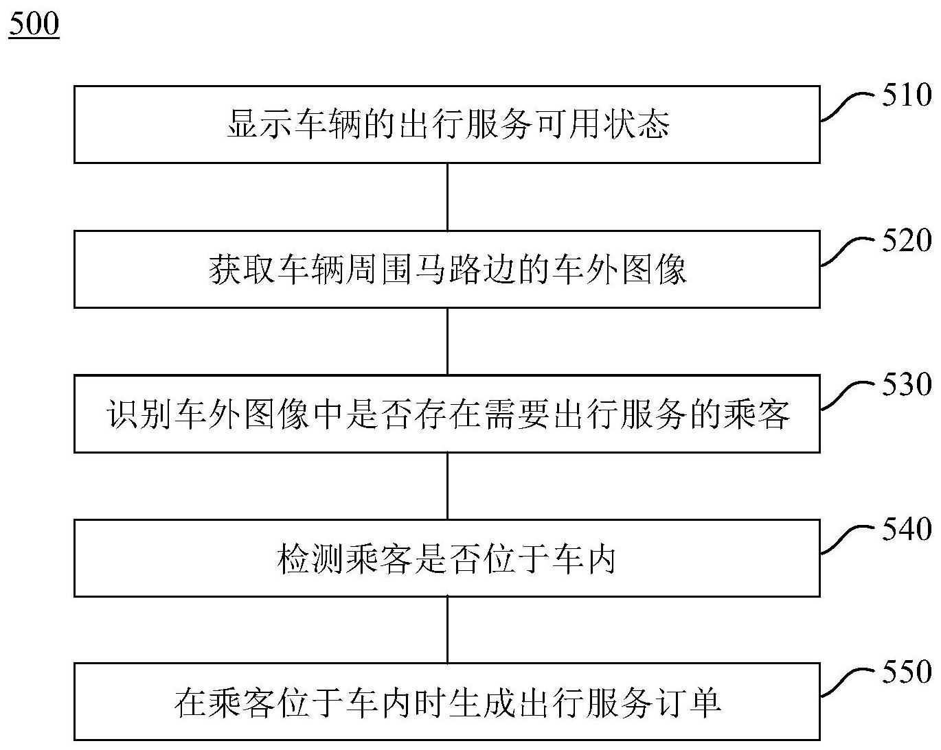 一种出行服务方法、装置及系统,以及一种出行服务引导系统。出行服务方法包括:车辆上的出行服务装置显示车辆的出行服务可用状态;出行服务装置和/或后台服务器检测乘客是否位于车内;以及在乘客位于车内时,出行服务装置或后台服务器生成出行服务订单。本发明的出行服务方法、装置及系统以及出行服务引导系统具有能够实现直接对马路边的乘客提供出行服务的特点。