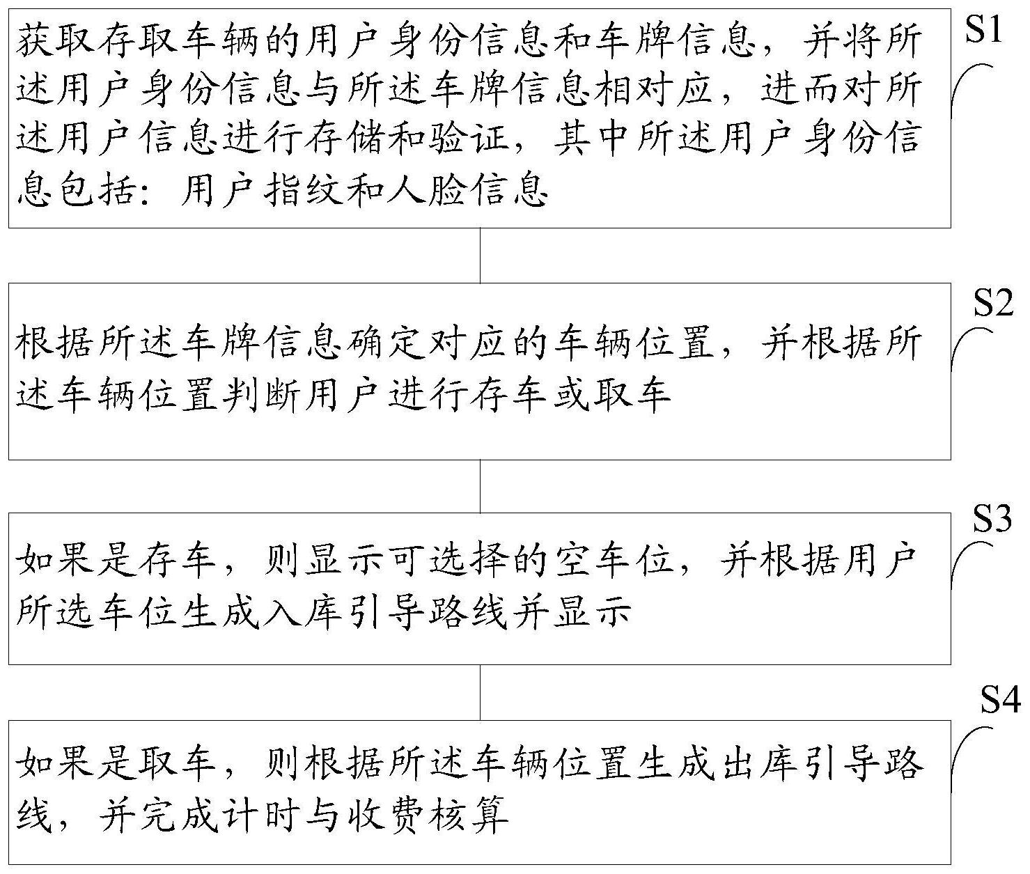 本发明提供一种车辆智能存取控制方法及系统,该方法包括:获取存取车辆的用户身份信息和车牌信息,并将所述用户身份信息与所述车牌信息相对应,进而对所述用户信息进行存储和验证,其中所述用户身份信息包括:用户指纹和人脸信息。根据所述车牌信息确定对应的车辆位置,并根据所述车辆位置判断用户进行存车或取车。如果是存车,则显示可选择的空车位,并根据用户所选车位生成入库引导路线并显示。如果是取车,则根据所述车辆位置生成出库引导路线,并完成计时与收费核算。本发明能提高车辆存取的效率和智能性。