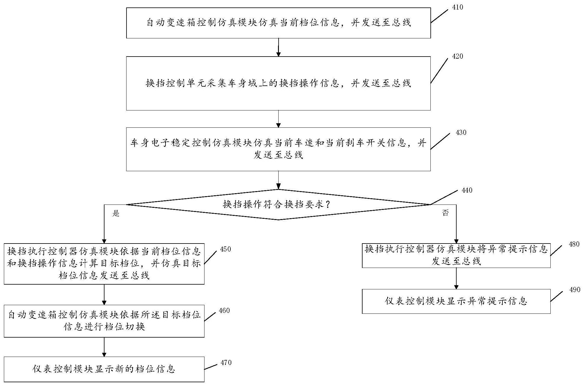 本申请公开了一种动力仿真方法、动力底盘仿真系统及车身域测试系统,动力仿真方法包括:自动变速箱控制仿真模块仿真当前档位信息,并发送至总线;换挡控制单元采集车身域上的换挡操作信息,并发送至总线;车身电子稳定控制仿真模块仿真当前车速和当前刹车开关信息,并发送至总线;换挡执行控制器仿真模块依据当前车速和当前刹车开关信息判断换挡操作是否符合换挡要求;若符合换挡要求,则换挡执行控制器仿真模块依据当前档位信息和换挡操作信息计算目标档位,并仿真目标档位信息发送至总线;自动变速箱控制仿真模块依据目标档位信息进行档位切换。本申请简化台架测试系统的搭建,提升了车身域电气功能测试的有效性和及时性。