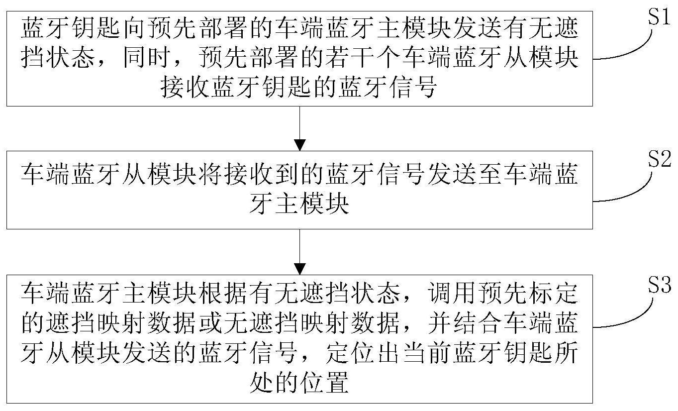 本发明公开了一种车用蓝牙钥匙定位方法,本发明的主要设计构思在于,获取蓝牙钥匙当前所处环境是否为遮挡环境,同时,部署在车辆周边的车端蓝牙从模块检测蓝牙钥匙的信号值并传送给车端蓝牙主模块,车端蓝牙主模块基于检测到的环境信息,调用预先在遮挡和无遮挡环境下标定的蓝牙信号与位置映射数据,并当前获取到的蓝牙信号强度,从而判断出蓝牙钥匙的位置,进而实现蓝牙控车。经实践以及与现有技术的比对,本发明可以显著提高对于蓝牙钥匙位置的判断准确性。