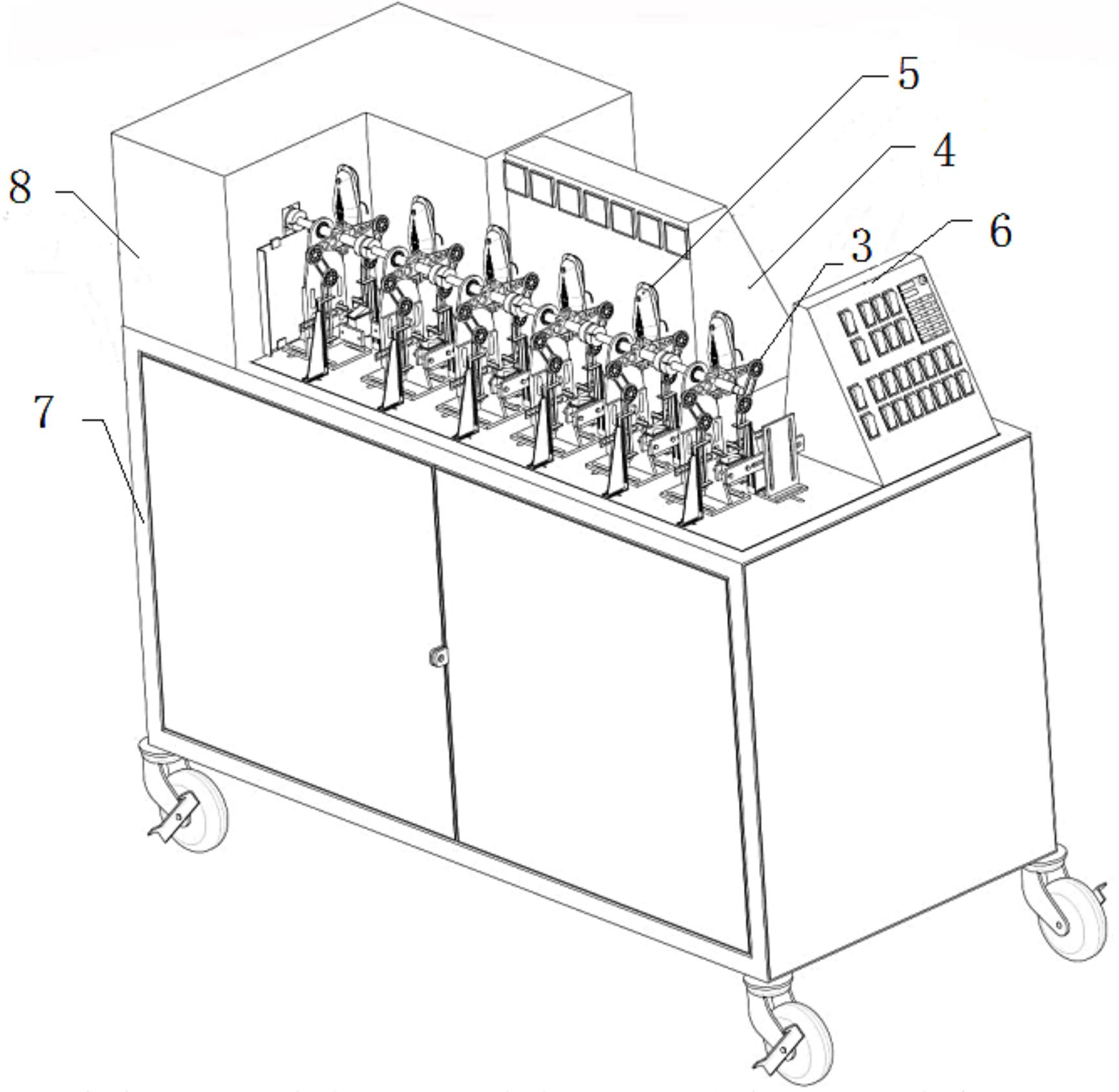 本发明涉及开关性能检测技术领域,公开了一种用于客车翘板式开关性能检测的串联式试验台,包括传动机构,其通过第一主轴连接驱动机构;多个执行机构,通过传动轴串联,并且靠近传动机构的传动轴与第一主轴连接以实现多个执行机构同时动作,每一传动轴周侧连接一对按压执行架,按压执行架与导向架配合以对被测件进行开关测试,按压执行架上设置微型压力传感器,被测件连接通断计数器;数采显示模块,连接安全警示模块,且包括若干用于显示测试参数的窗口;控制单元,包括多个控制开关,用于控制整个试验过程。本发明一个传动机构可以带动多个执行机构动作,同时对多个开关进行测试。
