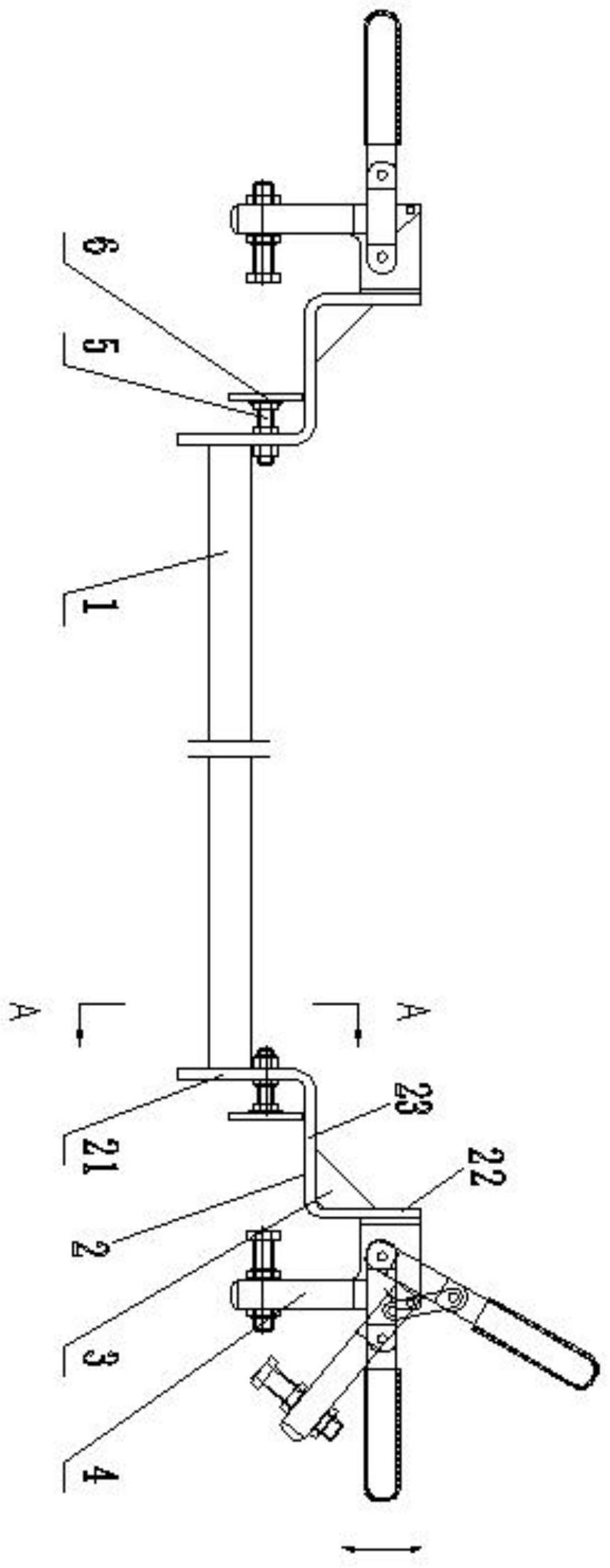 本发明公开一种客车前桥板簧定位卡具,包括横梁、夹具定位件、加强筋、快速夹、调节螺栓、定位板;横梁为一矩形管;夹具定位件呈Z型形状;两个夹具定位件的第一竖直边相向设置,横梁的两端分别与上述两个夹具定位件的第一竖直边连接;第一竖直边上开设有两个相对的螺孔,该螺孔位于横梁与第一竖直边连接处的上方;两个螺孔内均设有一调节螺栓,调节螺栓的螺帽端朝向外侧并焊接有定位板,调节螺栓另一端适配有调节螺母;夹具定位件的连接边与第二竖直边之间设有加强筋;第二竖直边的外侧螺栓连接有快速夹。本发明通过调节螺栓调节,可以适用不同间距定位,卡具通过一面靠紧板簧吊耳支架,另一面通过快速夹夹紧,定位吊耳支架安装。
