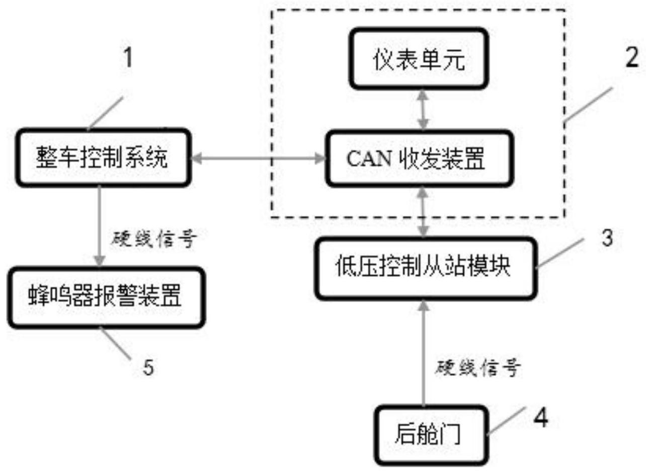 本发明公开了一种新能源客车的调试安全报警装置,包括整车控制系统、后舱门、低压控制从站模块、仪表单元、蜂鸣器报警装置;所述整车控制系统通过CAN总线与仪表单元交互连接;所述后舱门通过硬线信号与低压控制从站模块交互连接;低压控制从站模块通过CAN收发装置与仪表单元交互连接;所述整车控制系统还通过硬线信号与蜂鸣器报警装置连接。本发明的仪表单元通过低压控制总站模块接受舱门状态,然后通过CAN收发装置将舱门状态发送给整车控制系统,整车控制系统再通过判断状态发送硬线指令给蜂鸣器报警装置,从而减少了调试维修中的安全隐患,提高了调试或维修人员的安全。
