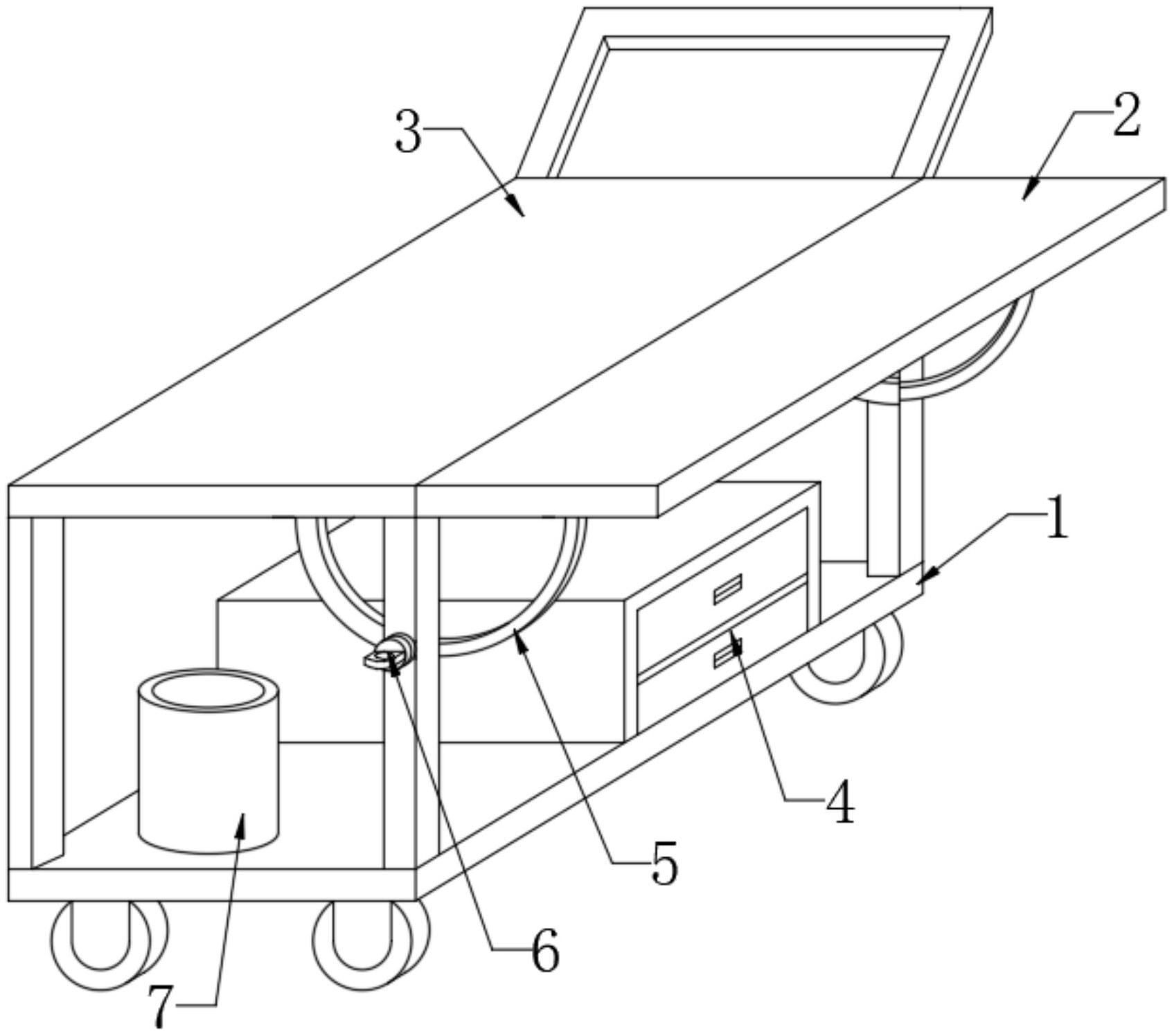 本实用新型提供一种便捷医疗检测车,所述放置板右侧表面铰接有加长板,所述放置板下端表面前侧与后侧分别固定有一个连接导轨,所述连接导轨内部开设有导向槽,所述固定套座内活动连接有限位杆,所述限位杆上通过连接板连接有复位弹簧,所述复位弹簧的上端与固定套座内部顶端连接,所述限位杆的尾端穿过连接导轨置于导向槽内,与现有技术相比,本实用新型具有如下的有益效果:可根据使用需求来增大医疗检测车的承载面积,避免出现东西过多而车体放不下的情况发生,且能够对加长板进行折叠,便于该医疗检测车的移动,配合设置的限位挡块与吸附块,在将加长板进行折叠后,能够对加长板进行固定,防止加长板的晃动。