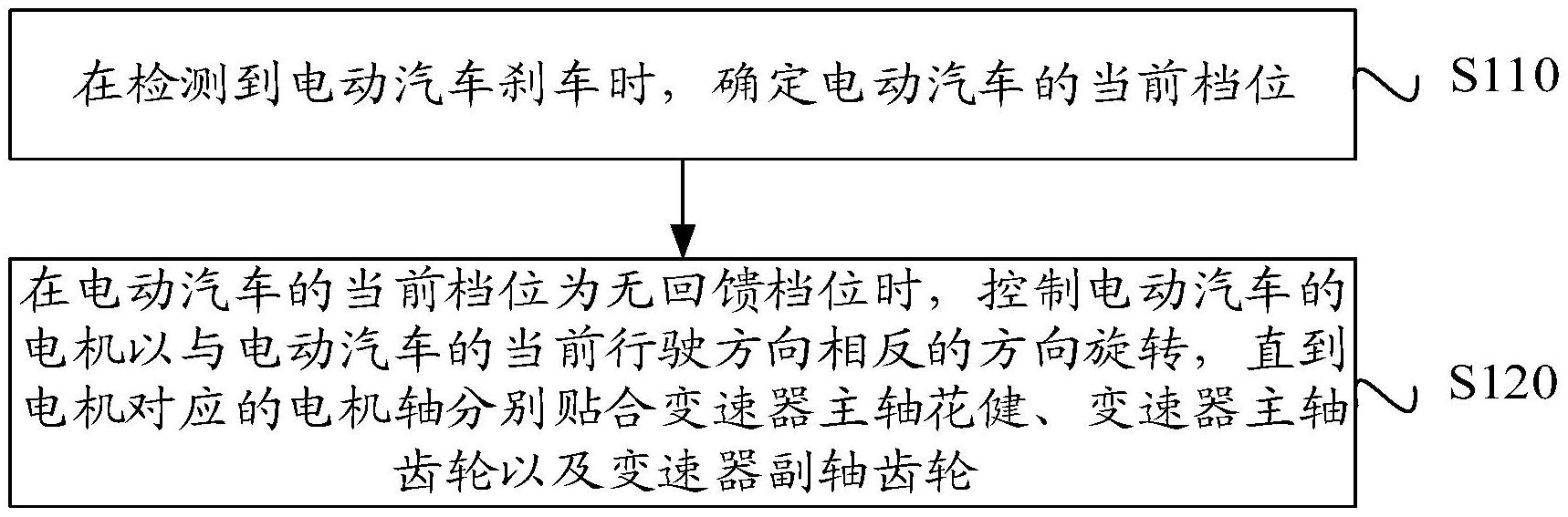 本申请涉及一种电动汽车控制方法及装置、电子设备及存储介质。方法包括:在检测到电动汽车刹车时,确定电动汽车的当前档位;在电动汽车的当前档位为无回馈档位时,控制电动汽车的电机以与电动汽车的当前行驶方向相反的方向旋转,直到电机对应的电机轴贴合变速器主轴花键、变速器主轴齿轮贴合变速器副轴齿轮。采用本方法能够减小电动汽车在无回馈档位时由于机械部件之间的间隙导致的异响。