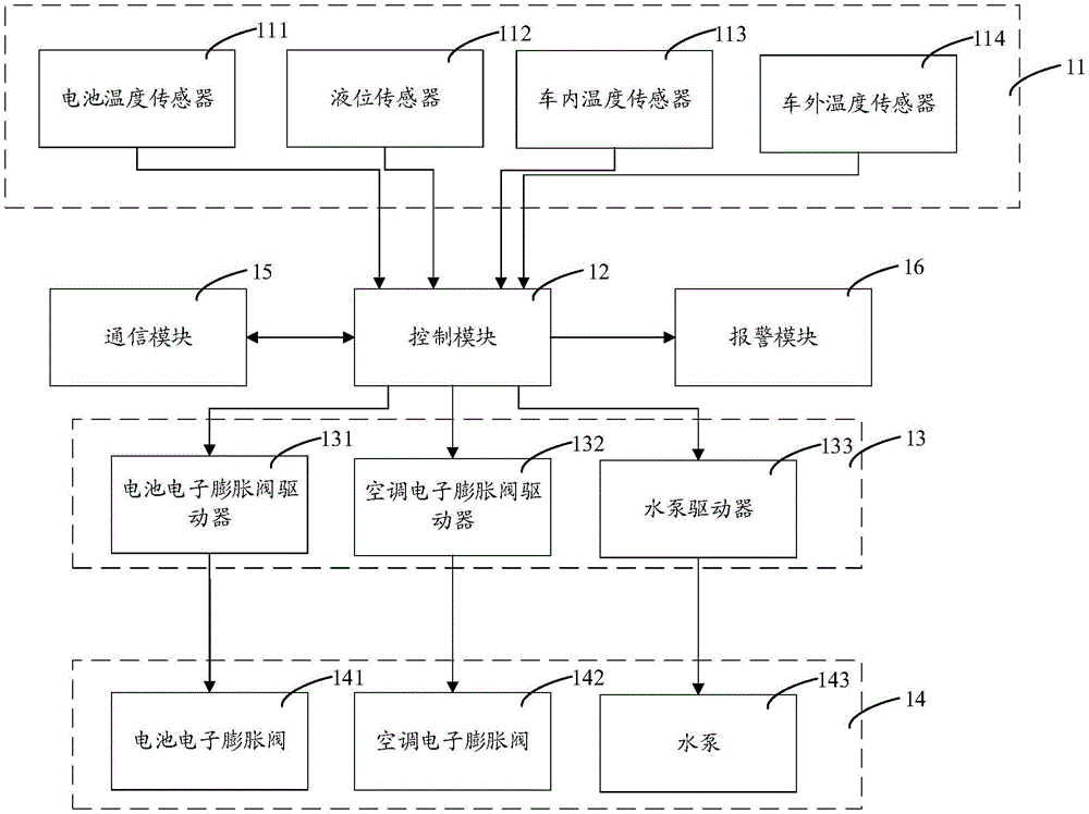 本实用新型公开了一种电动汽车空调控制系统,包括采集模块、控制模块、驱动模块和调节模块,所述采集模块、所述控制模块、所述驱动模块和所述调节模块顺序相连,所述采集模块包括电池状态采集装置和环境温度采集装置,所述电池状态采集装置用于采集电池状态,所述环境温度采集装置用于采集车内外温度信息,所述控制模块根据所述采集模块传送的信号输出相应控制信号控制所述驱动模块,所述驱动模块根据所述控制模块输出的控制信号驱动所述调节模块调节电池温度与空调制冷制热效率。上述电动汽车空调控制系统可以同时对车厢和电池进行制冷或加热,达到同时控制车厢温度和电池温度的效果。