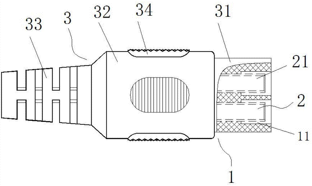 本实用新型公开了一种注塑一体成型的航空插头,其特征在于,其包括航空插头本体,该航空插头本体包括铜管端子,及通过注塑一体成型、包覆在铜管端子四周形成航空插头外壳结构的塑胶体,所述铜管端子固定在塑胶体内部,并连接导线。航空插头为注塑一体成型工艺制作,将铜管端子的外部注塑成型塑胶体,形成注塑一体成型的航空插头,铜管端子在塑胶体内固定不动,相对于普通航空插头的金属壳,插头插座采用螺丝扣固定方式经多次插拔容易导致松动,本实用新型基本解决了普通航空插头经多次插拔导致松动的问题,并且成本低,大大简化了工艺,外被为塑胶体,安全系数高,插头头部寿命长。