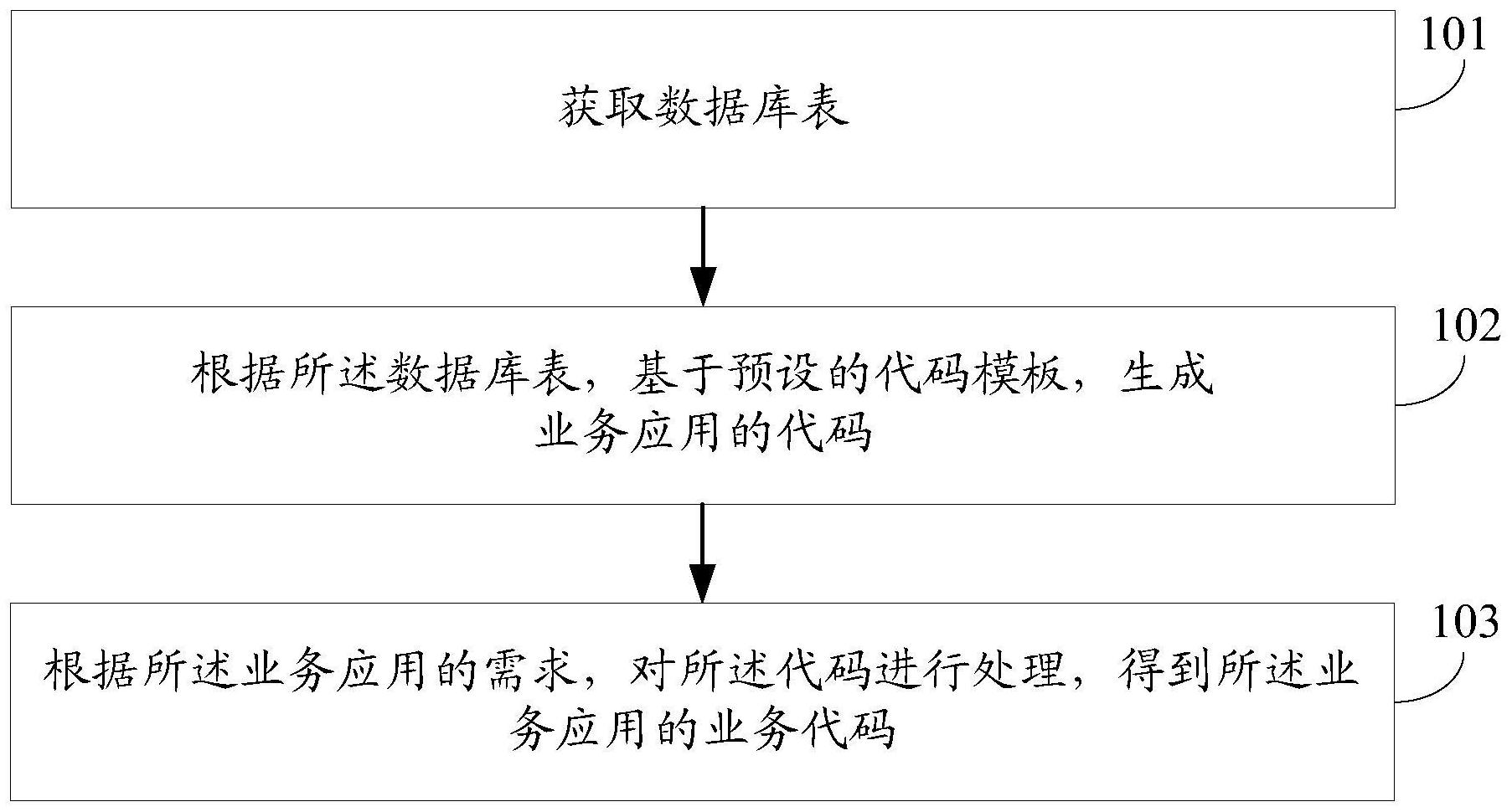 本发明提供一种代码生成方法及代码生成装置,其中,所述代码生成方法包括:获取数据库表;根据所述数据库表,基于预设的代码模板,生成业务应用的代码;根据所述业务应用的需求,对所述代码进行处理,得到所述业务应用的业务代码。本发明的方案,可以在业务应用代码的开发过程中,减少甚至避免手动编写代码,从而节省代码开发时间;进一步的,因基于预设模板生成业务应用的代码,可以使得业务应用代码的编写风格一致,参数命名、格式等统一,从而规范业务代码,给后期维护带来便利。