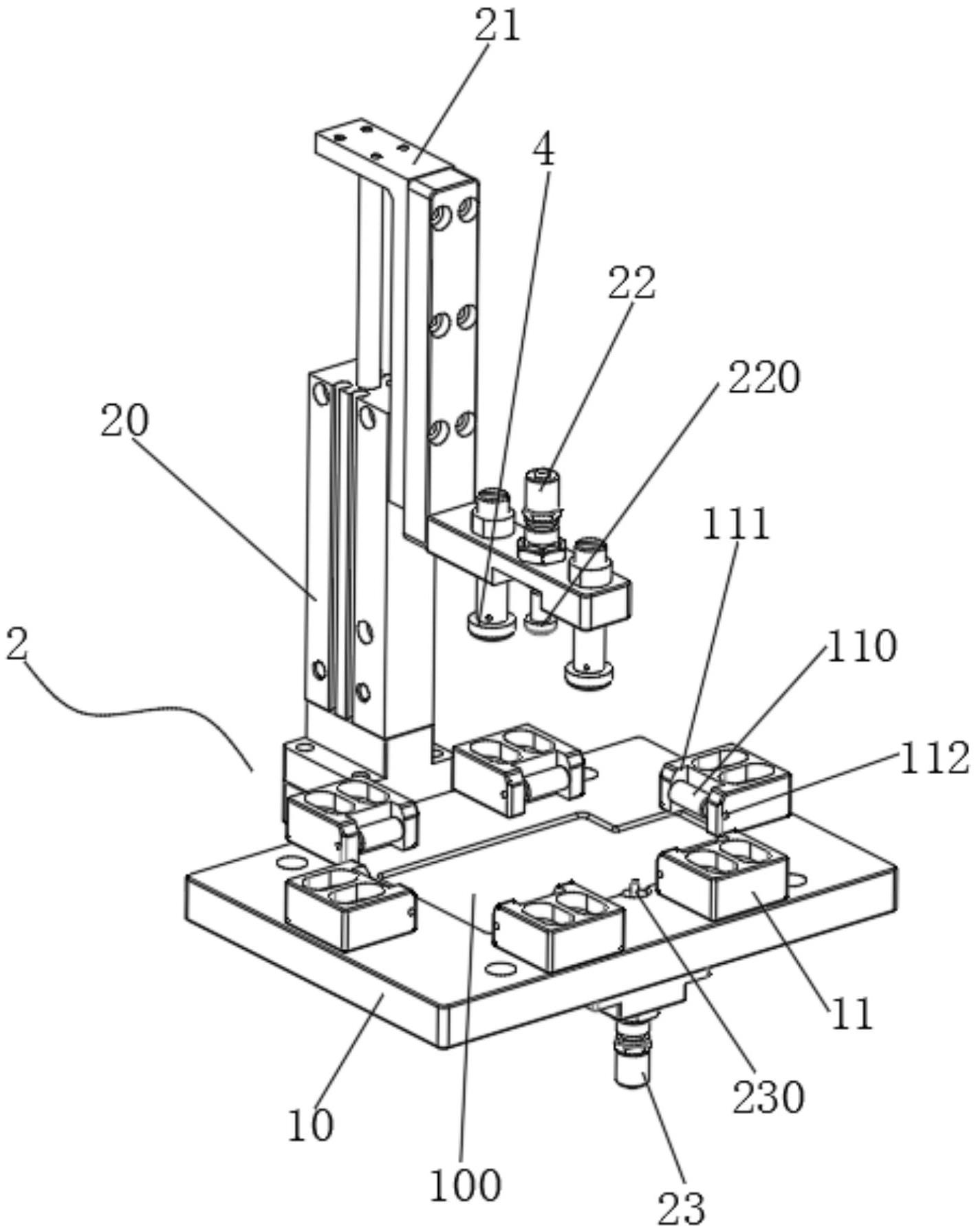 一种数据卡终端MMI自动检测装置,包括:设置有检测组件(2)的底座(10)以及LED灯组(5),底座设置有定位区(100),在定位区周边设置有多个带有滚动定位柱(110)的调整块(11),检测组件包括压紧气缸(20)、连接件(21)、装在连接件上的POWER气缸(22)以及由POWER气缸驱动作用于被检测数据卡上POWER开关的POWER压头(220)、装在底座底部的RESET气缸(23)以及RESET气缸驱动作用于被检测数据卡上RESET开关的RESET压头(230),还包括电子高清显微镜(3);使用本实用新型具备减轻检测人员的疲劳程度,加快了检测效率,避免了误判检测结果的情况。