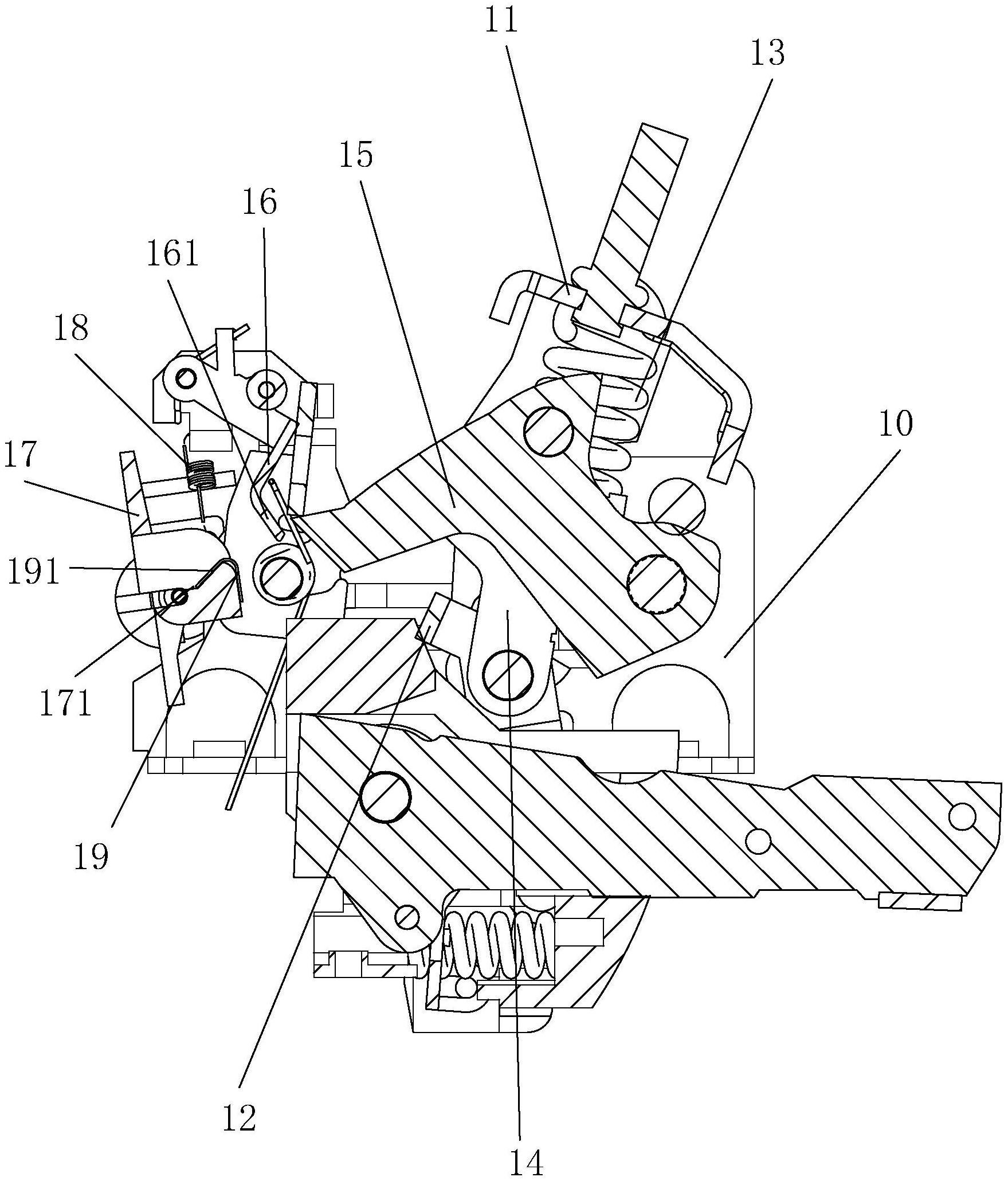 本实用新型涉及一种高可靠断路器的操作机构,包括机构架、转动设置在机构架上的杠杆、上连杆、设置在上连杆与杠杆之间的拉簧、与上连杆联动配合的下连杆、与下连杆联动配合的跳扣、与跳扣相配合的再扣、转动设置在机构架上的牵引杆、设置在牵引杆与机构架之间的复位拉簧,牵引杆上对应再扣处设置有锁定槽,所述的牵引杆上对应锁定槽处设置有小锁扣,所述的小锁扣的一端上具有包裹在锁定槽内的锁定斜面,所述的再扣上设置有与锁定斜面相配合的折弯部,所述的折弯部卡合在锁定斜面上,且构成小锁扣与再扣的限位配合。本实用新型具有结构简单、性能稳定可靠、装配便捷、高可靠的优点。