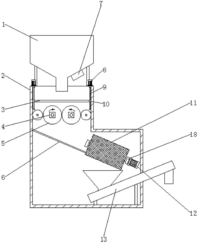 本实用新型公开了一种自走式葫芦机的双筒清选装置,包括破碎室,所述破碎室顶部设置有储存室,且储存室内壁设置有弹簧,所述弹簧一侧设置有缓冲接料板,且缓冲接料板和弹簧关于储存室内壁的左右两侧均有设置,并且储存室底部设置有振动电机,所述破碎室内壁设置有丝杆,所述破碎室内壁设置有破碎滚筒组,且破碎滚筒组位于压板底部。该自走式葫芦机的双筒清选装置通过在破碎室顶部设置储存室,使收割的葫芦进入到储存室内部经过储存室内部的缓冲接料板的拨动进行阶段性下料,由此避免破碎室内部物料过多,同时在破碎室内部设置压板,通过丝杆等组件带动压板挤压葫芦贴近破碎滚筒组,由此提高破碎效率,避免出现破碎不彻底的现象。