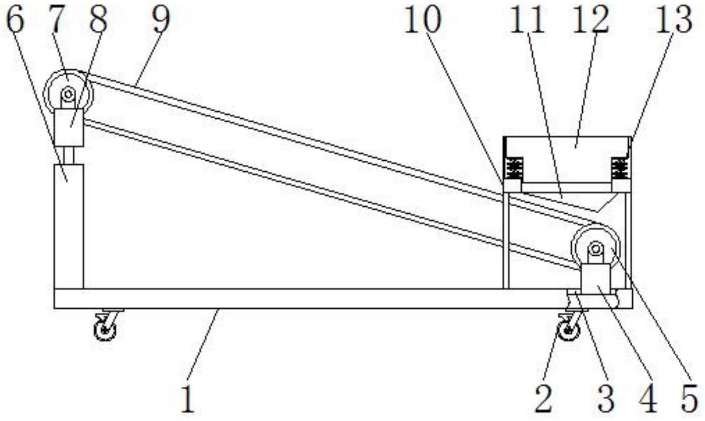 本实用新型公开了一种农用装载机自动下料输送平台,包括固定底座,所述固定底座的下端设有自锁轮,且固定底座的上端设有气缸和支撑架,并且固定底座上端开设有固定卡槽,所述固定卡槽内部设置有“U”形的第一固定座,且第一固定座开口端固定有第一输送轮,所述气缸的上端设有第二固定座,且第二固定座的上端设有第二输送轮,并且第二输送轮和第一输送轮外部套设有送料带,所述支撑架的上端设有支撑弹簧,且支撑弹簧上端设有导料框。该农用装载机自动下料输送平台上设有导料结构,可以将运输车上的物料接住,同时该装置上设有缓冲结构,避免运输车对该装置造成挤压的时候,挤压部位出现形变的情况,提高该装置的使用寿命。