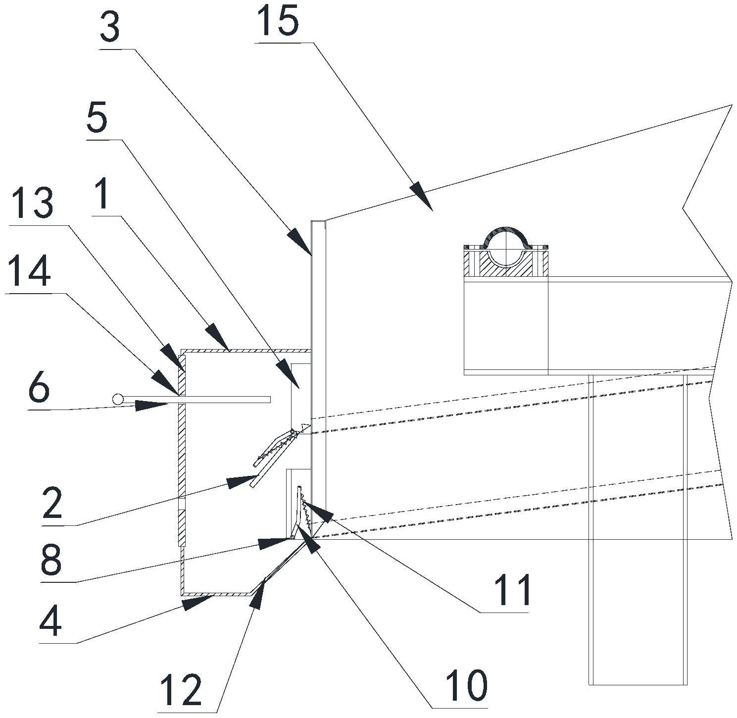 本实用新型公开了一种筛分机的出料端防风卸料装置,包括有防风罩、挡板,筛分机的出料端固定设有防风罩,防风罩的底端端面设有卸料口,防风罩内部设有多个筛分机的出料口,各个筛分机的出料口分别固定有出料管,出料管与筛分机的内部连通,出料管的末端扣设有挡板,挡板的底端与出料管的外壁通过转轴转动连接,挡板上固定设有连接杆,防风罩上开设有与连接杆对应设置的长条孔,连接杆的末端活动贯穿长条孔且置于防风罩的外侧,连接杆的末端固定设有把手,把手与筛分机的外壁之间设有弹簧,弹簧的一端与把手固定连接,弹簧的另一端与筛分机的外壁固定连接。