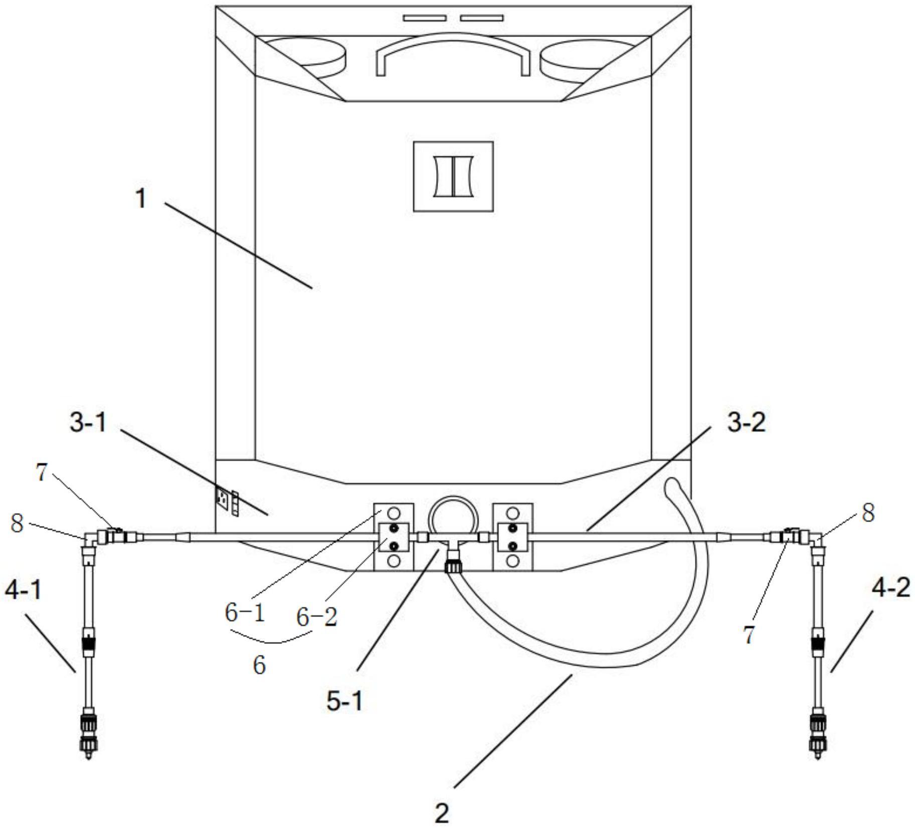 本实用新型公开了一种后置式喷杆喷雾设备,包括喷雾壶;伸缩喷杆,所述伸缩喷杆安装于所述喷雾壶,并与所述喷雾壶液体连通;以及下探伸缩杆,所述伸缩喷杆上安装有至少两根下探伸缩杆,并且所述下探伸缩杆带有喷头。工作原理:施药人员背起喷雾壶,伸缩喷杆位于施药人员的背部,施药人员向前移动,喷雾壶向伸缩喷杆输送药液,伸缩喷杆再将其内的药液分配至各下探伸缩杆,下探伸缩杆上的喷头向外雾化喷出药液,即可对作物实现喷施药液。本实用新型具有能多喷头、喷幅宽、喷幅可调及均匀喷雾,且喷杆后置,避免施药人员移动喷药时,踩踏或触碰到已喷撒药液的防治对象等特点。