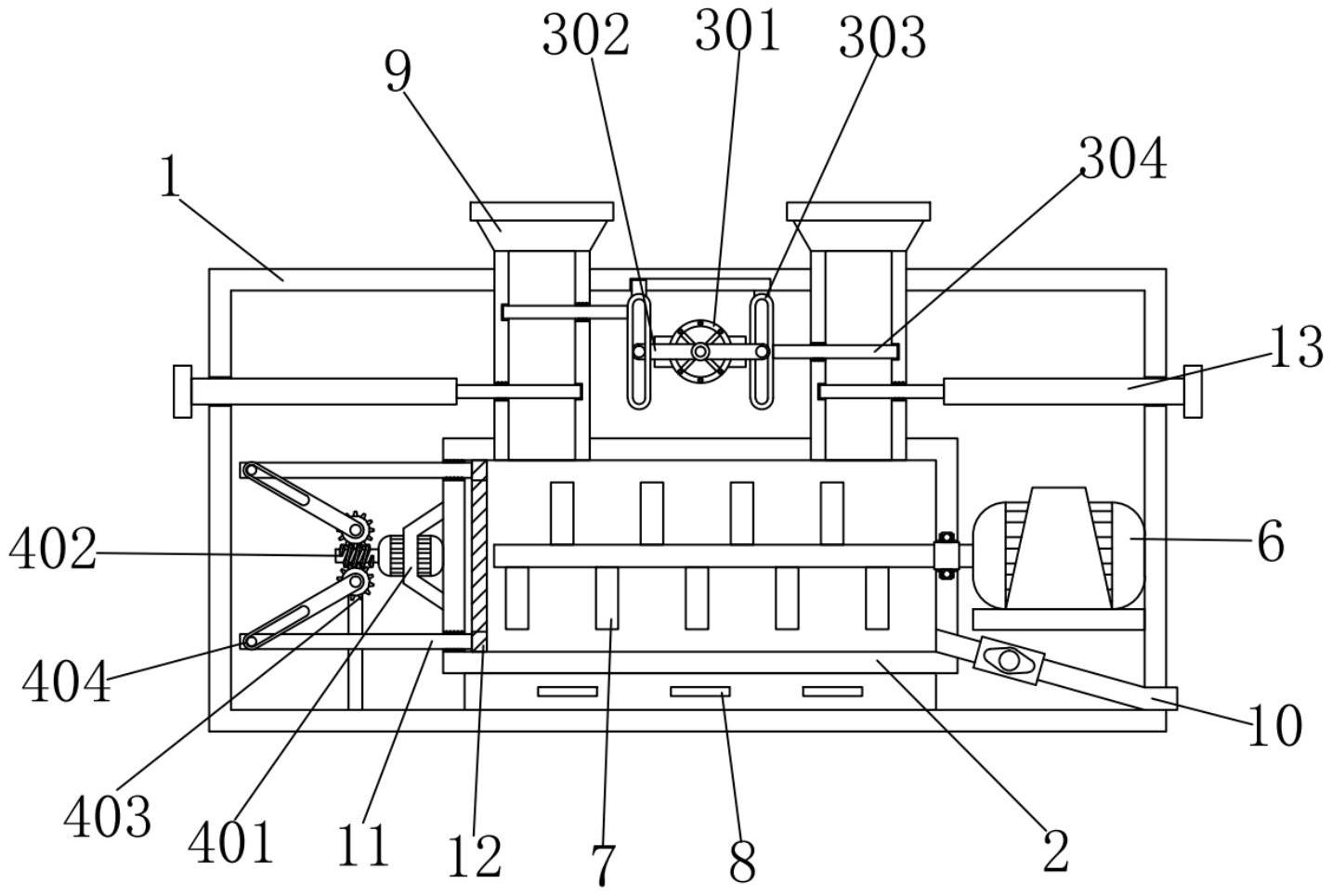 本实用新型公开了一种微囊缓释制剂生产系统,包括机壳,所述机壳的内部下方与搅拌室相固接,所述搅拌室的底部安装有多个电加热板,所述搅拌室的顶部开设有两个进料管,所述搅拌室的一侧与出料管相连通,所述机壳的内部右侧通过支架与第一电机相固接,所述第一电机的输出端与搅拌杆相固接。该微囊缓释制剂生产系统,通过第二电机、竖板和控料板之间的配合,启动第二电机,第二电机的输出端带动第一连杆转动,第一连杆会通过滑槽使两侧竖板向外侧移动,竖板带动控料板移动,控料板会将溶液进行分层,解决了现有的微囊缓释制剂生产系统在对囊材和囊心物的比例控制大多需要人为测量,在倒入搅拌室内,即会出现误差,又会影响生产效率的问题。