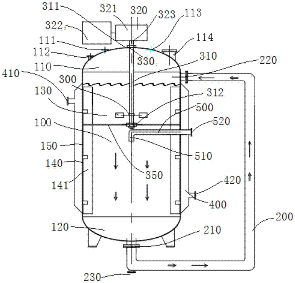 本实用新型公开的外管气泡留滞式发酵罐,包括发酵罐罐体,其还包括设置在发酵罐罐体底部的循环出料口和上部的循环进料口,循环出料口与循环进料口通过一设置在发酵罐罐体外的物料循环外管联通;一设置在发酵罐罐体内上部位置的搅拌推进器;一空气进口管,空气进口管的出口位于发酵罐罐体内并位于搅拌推进器的下方,入口位于发酵罐罐体外与无菌空气源连接。本实用新型结构合理,保证微生物发酵供氧的顺利进行,大大减少所需无菌空气量,从而降低发酵运行成本。