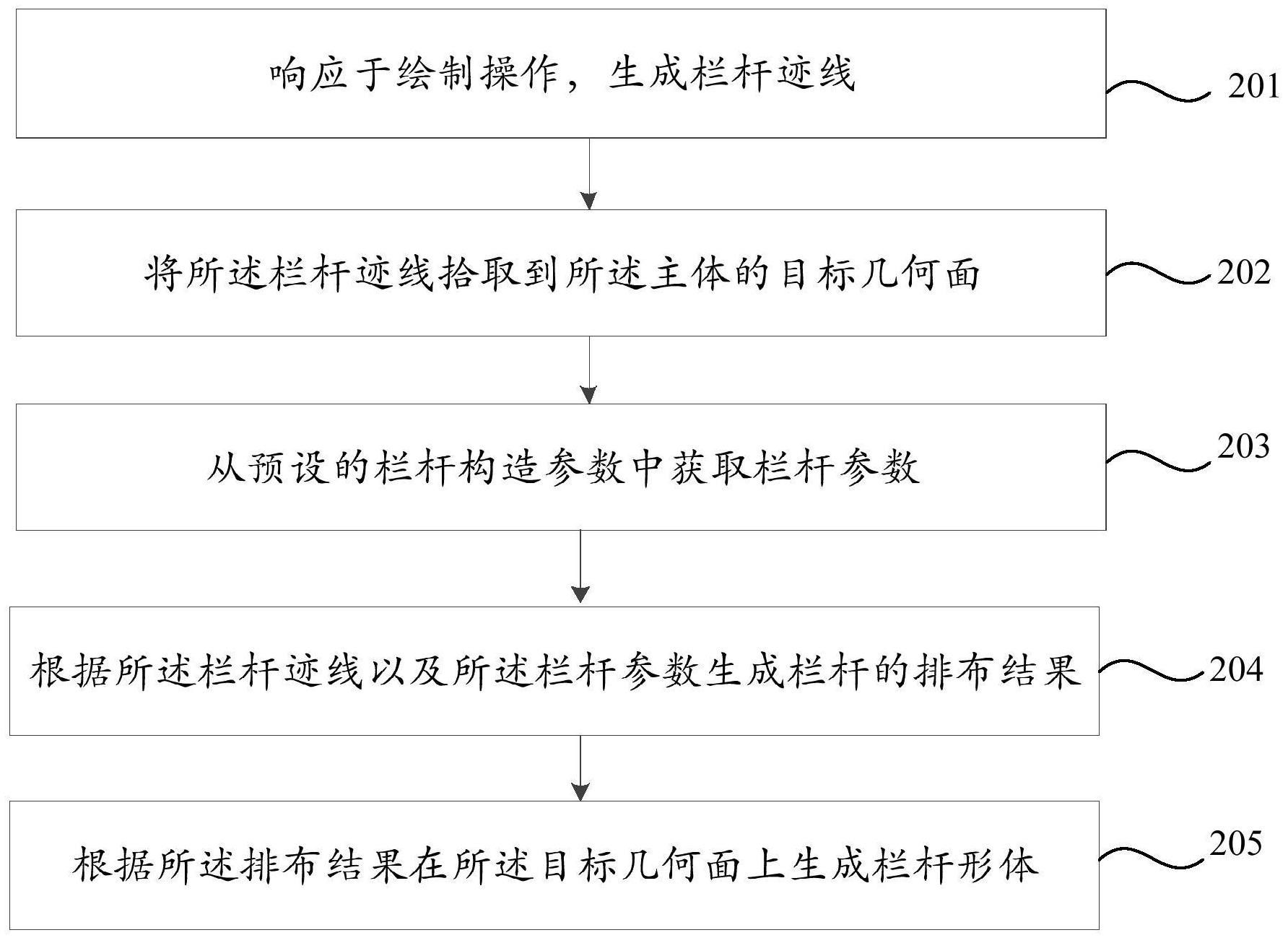 本发明一个或多个实施例提供了一种创建栏杆几何模型的方法、装置、存储介质及电子设备,其中,创建栏杆几何模型的方法包括:响应于绘制操作,生成栏杆迹线,其中,所述栏杆迹线指定了栏杆所归属的主体;将所述栏杆迹线拾取到所述主体的目标几何面;从预设的栏杆构造参数中获取栏杆参数;根据所述栏杆迹线以及所述栏杆参数生成栏杆的排布结果;根据所述排布结果在所述目标几何面上生成栏杆形体,本发明实施例使得栏杆几何模型的创建不再依赖于已有构件分类。