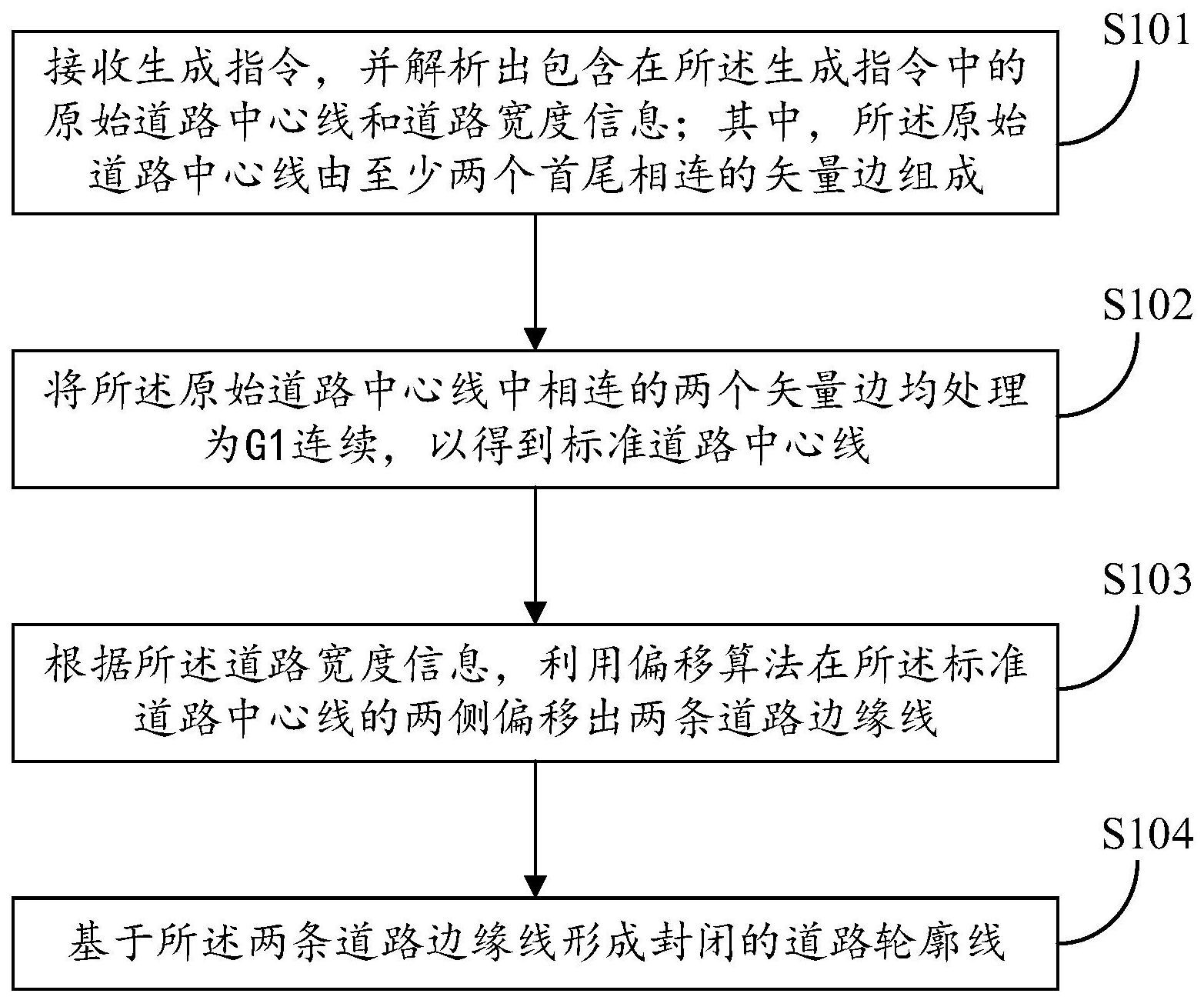 本发明公开了一种生成道路轮廓线的方法、装置、设备及可读存储介质,所述方法包括:接收生成指令,并解析出包含在所述生成指令中的原始道路中心线和道路宽度信息;其中,所述原始道路中心线由至少两个有序的且首尾相连的矢量边组成;将所述原始道路中心线中相连的两个矢量边均处理为G1连续,以得到标准道路中心线;根据所述道路宽度信息,利用偏移算法在所述标准道路中心线的两侧偏移出两条道路边缘线;基于所述两条道路边缘线形成封闭的道路轮廓线;本发明能够高效、稳定的根据任意形态的道路中心线来生成道路轮廓线。