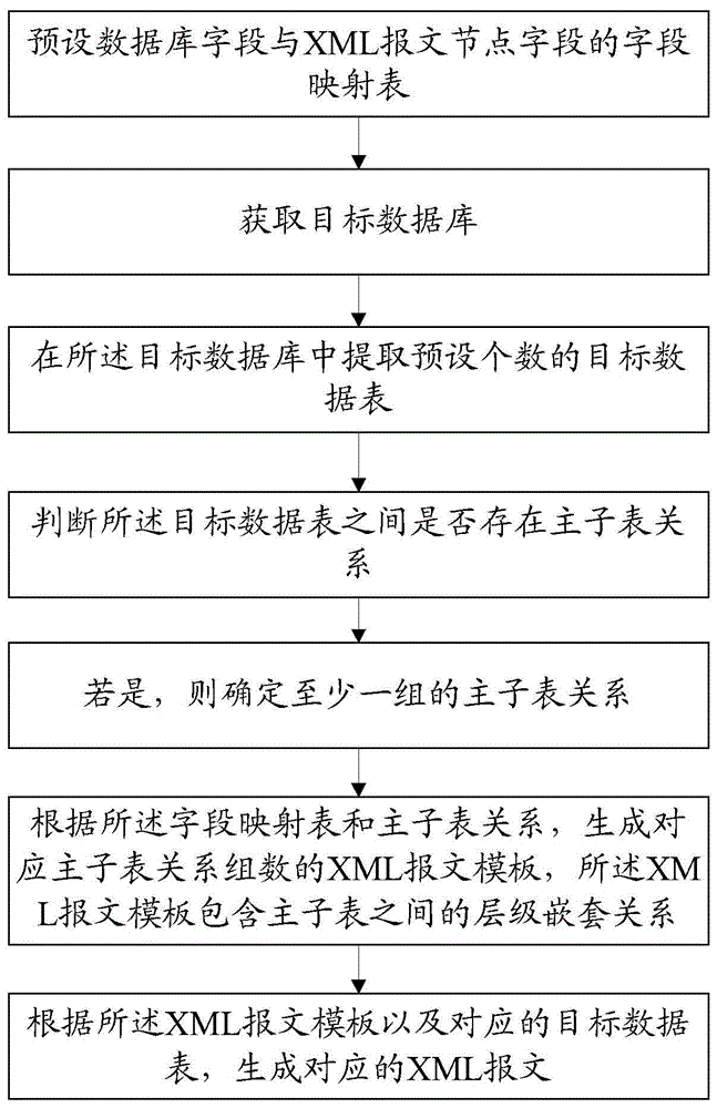 本发明公开了一种数据库表和XML报文的转换方法及其系统,方法包括:预设数据库字段与XML报文节点字段的字段映射表;获取目标数据库;在所述目标数据库中提取预设个数的目标数据表;判断目标数据表之间是否存在主子表关系;若是,则确定至少一组的主子表关系;根据字段映射表和主子表关系,生成对应主子表关系组数的XML报文模板,XML报文模板包含主子表之间的层级嵌套关系;根据XML报文模板以及对应的目标数据表,生成对应的XML报文。本发明可实现数据表与XML报文之间的相互转换,减少项目开发、测试、管理的投入成本,提高报文解析效率,且便于管理和维护。