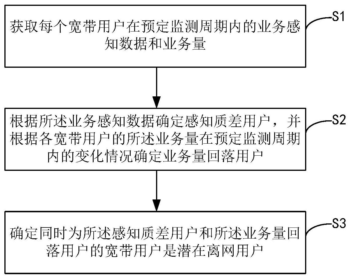 本申请公开了识别宽带业务中潜在离网用户的方法及装置,该方法首先获取每个宽带用户在预定监测周期内的业务感知数据和业务量。然后,根据所述业务感知数据确定感知质差用户,并根据该预定监测周期内各宽带用户的业务量变化确定业务量回落用户。最后,确定同时为所述感知质差用户和所述业务量回落用户的宽带用户是潜在离网用户。可见,通过本申请方法关联业务感知数据和业务量数据识别潜在离网用户,确定的潜在离网用户同时具有历史离网用户的感知质差特征和业务量回落特征,识别结果具有更高的准确性。