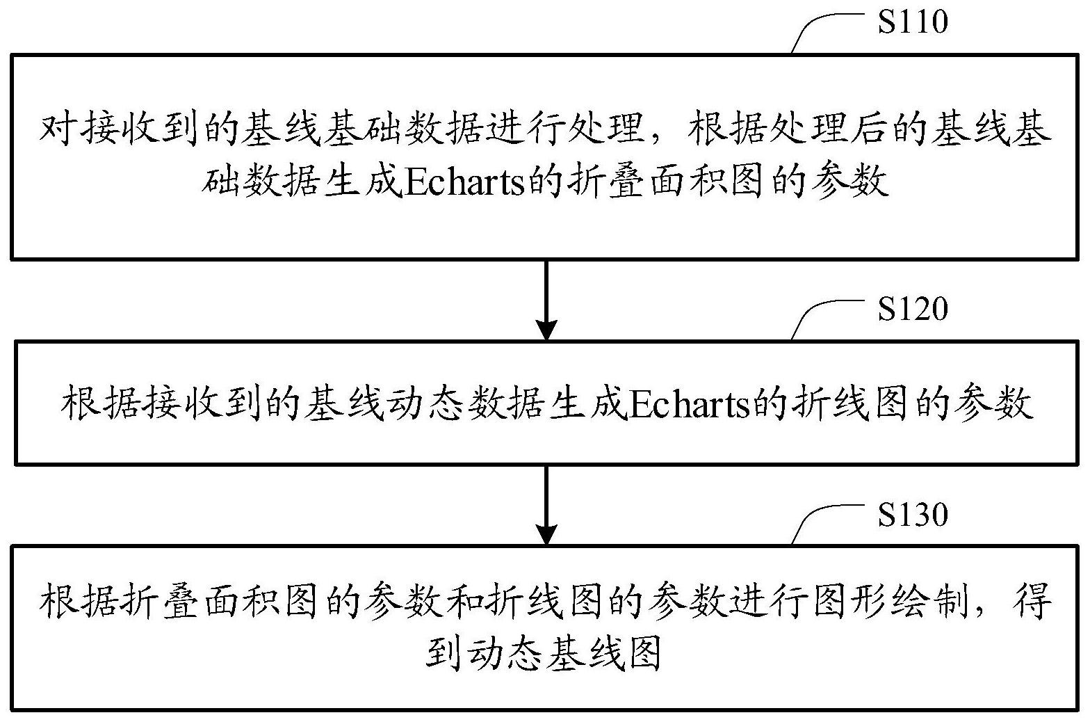 本发明公开了一种基于Echarts实现动态基线图绘制的方法和装置。所述方法包括:对接收到的基线基础数据进行处理,根据处理后的基线基础数据生成Echarts的折叠面积图的参数;根据接收到的基线动态数据生成Echarts的折线图的参数;根据所述折叠面积图的参数和所述折线图的参数进行图形绘制,得到动态基线图。该技术方案巧妙地利用了Echarts中已有的图例,通过对数据进行合理的处理实现了动态基线图的绘制,拓展了Echarts的功能,实现了产品开发人员需要的数据分析图形,对产品的开发有着良好的帮助。