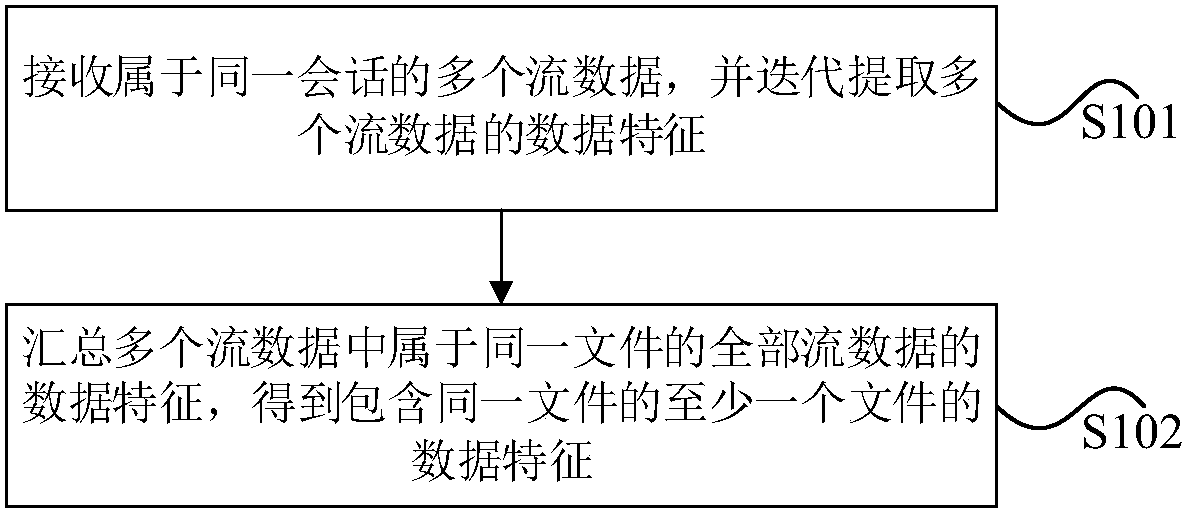 本发明提供了一种文件的数据特征提取方法、装置及病毒特征检测系统。其中,该文件的数据特征提取方法包括:接收属于同一会话的多个流数据,并迭代提取多个流数据的数据特征;汇总多个流数据中属于同一文件的全部流数据的数据特征,得到包含同一文件的至少一个文件的数据特征。通过本发明,解决了相关技术中进行文件的特征提取需要还原流数据导致的效率低、占用资源高的问题,提高了文件的特征提取效率,降低了文件的特征提取的资源占用。