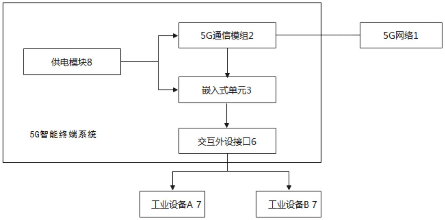 本实用新型主要是为了解决现有的5G智能终端无法满足5G应用场景越来越高的时间同步和时间精度要求的问题,公开了一种基于5G精准授时的智能终端系统,包括与5G网络连接的5G通信模组,5G通信模组连接有嵌入式单元,嵌入式单元通过交互外设接口与工业设备连接;嵌入式单元为多架构处理器,包括A53处理器和M7处理器。本实用新型的M7处理器解析5G通信模组输出的B码脉冲码流获得高精度时间信息,然后通过交互外设接口将高精度时间信息发送给工业设备,工业设备根据高精度时间信息控制运行,以保证时间同步和时间精度,实现精准授时;本实用新型可连接多台工业设备,有利于5G网络在传统工业领域的快速推广。
