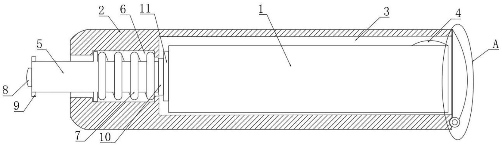 本实用新型公开了一种小巧收缩的语音提示设备,包括提示设备主体与收纳箱,所述收纳箱内部设置有伸缩机构,所述伸缩机构包括第一限位槽,所述第一限位槽开设于收纳箱一端表面,所述提示设备主体顶端一侧设置有扬声器,且所述提示设备主体另一端设置有橡胶垫,所述橡胶垫一侧设置有轴承,所述轴承一侧设置有限位块;通过设计了伸缩机构,只需要推动转块,然后转动转块,即可完成将提示设备主体推出固定的操作,传统的提示设备没有伸缩机构,使得提示设备主体在放置时,容易碰撞到其他的物品造成损坏,通过设计了本机构,使得提示设备主体能够有效的被保护起来,防止造成损坏,增加了提示设备主体的使用寿命。