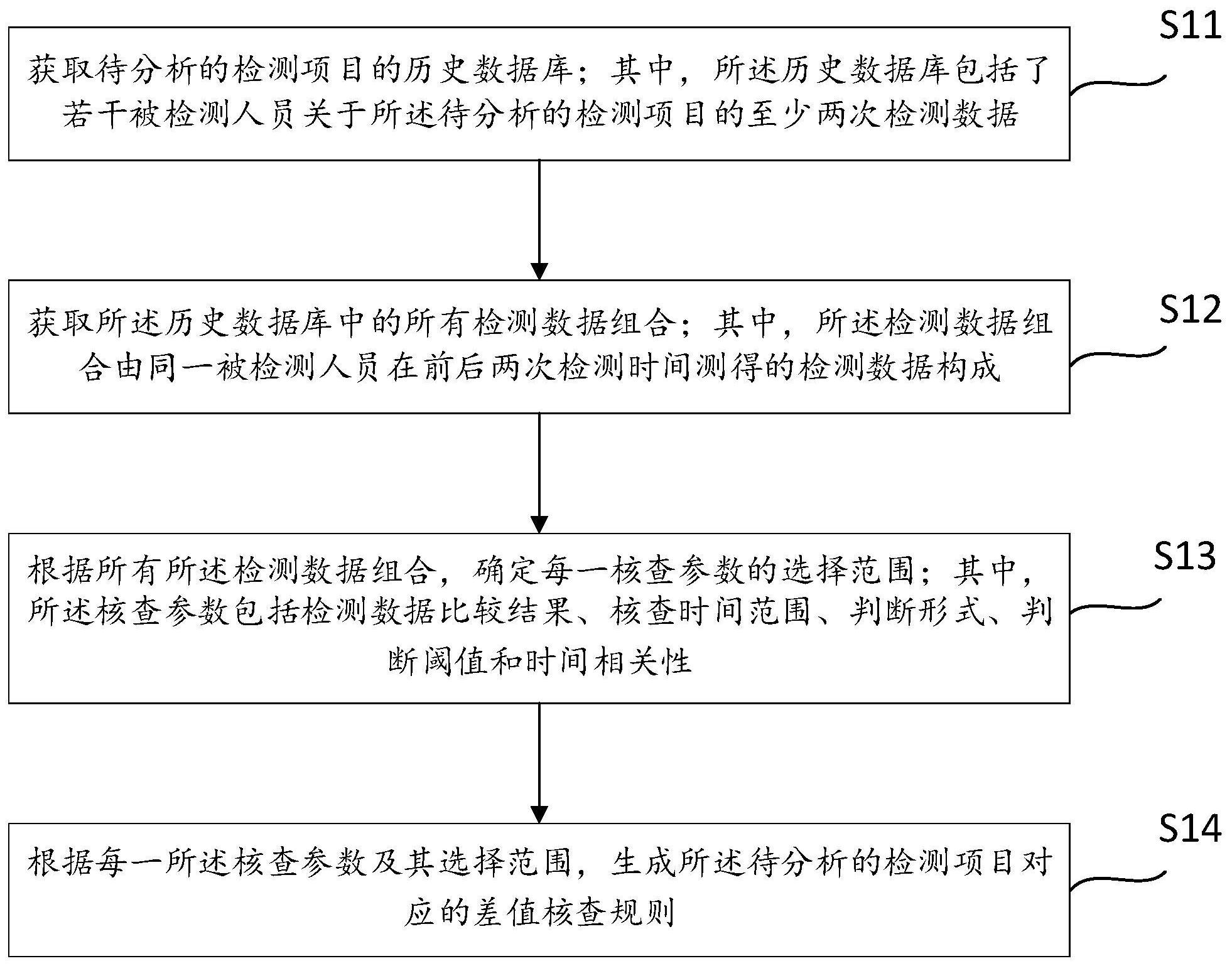 本发明公开了一种差值核查及差值核查规则的制订方法和装置。所述制订方法包括:获取待分析的检测项目的历史数据库;所述历史数据库包括了若干被检测人员关于所述待分析的检测项目的至少两次检测数据;获取所述历史数据库中的所有检测数据组合;所述检测数据组合由同一被检测人员在前后两次检测时间测得的检测数据构成;根据所有所述检测数据组合,确定每一核查参数的选择范围;所述核查参数包括检测数据比较结果、核查时间范围、判断形式、判断阈值和时间相关性;根据每一所述核查参数及其选择范围,生成所述待分析的检测项目对应的差值核查规则。采用本发明实施例,能有效提高所制订的差值核查规则的科学合理性,从而提高差值核查的准确性。