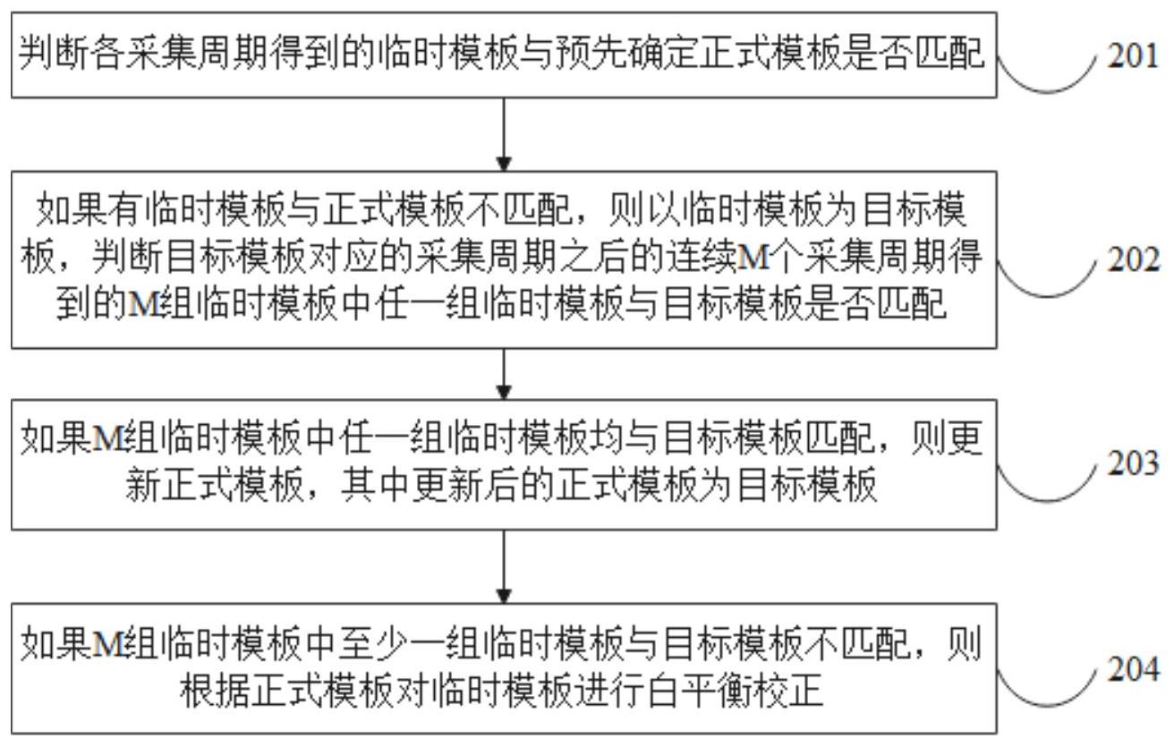 本发明涉及一种图像白平衡校正方法方法、装置,该方法包括:判断各采集周期得到的临时模板与预先确定正式模板是否匹配;如果有临时模板与正式模板不匹配,则以临时模板为目标模板,判断目标模板对应的采集周期之后的连续M个采集周期得到的M组临时模板中任一组临时模板与目标模板是否匹配;如果M组临时模板中任一组临时模板均与目标模板匹配,则更新正式模板,其中更新后的正式模板为目标模板;如果M组临时模板中至少一组临时模板与目标模板不匹配,则根据正式模板对临时模板进行白平衡校正。上述方法复杂度低,准确度较高,可以有效解决了夜晚交通摄像头画面中信号灯颜色偏色的问题。
