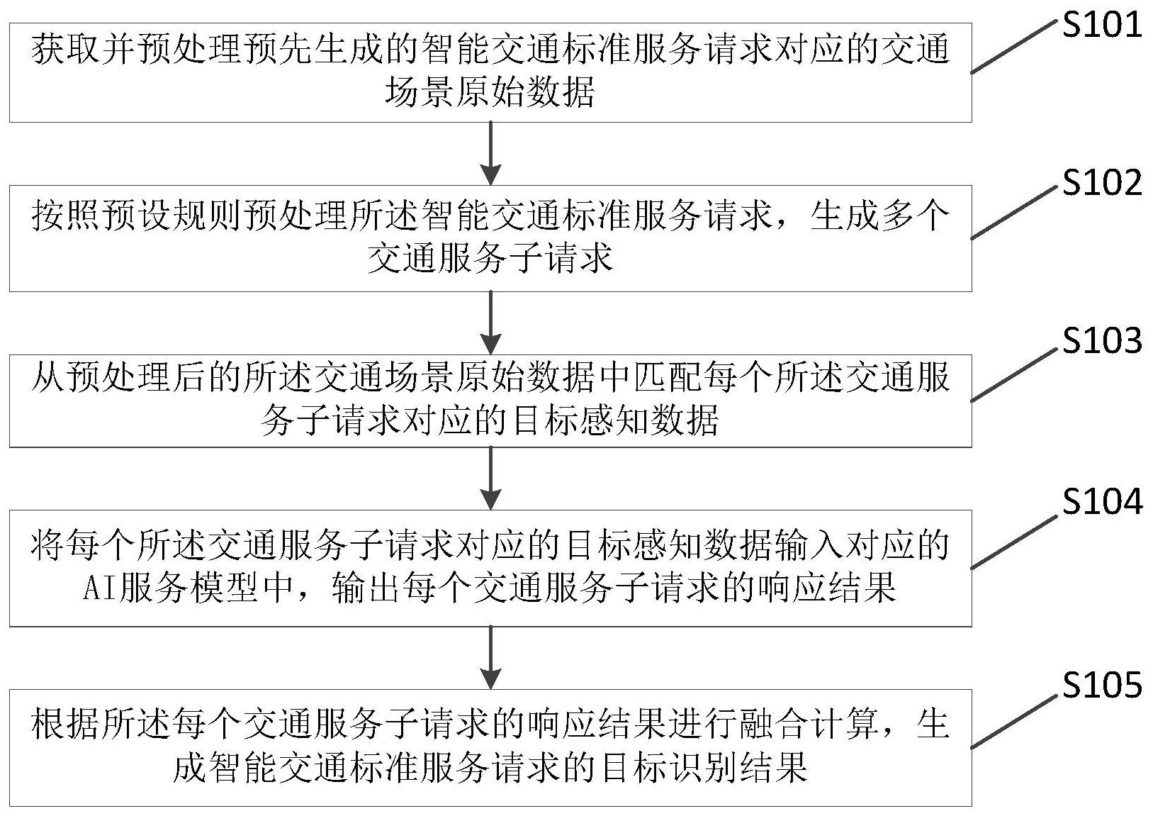 本发明公开了一种基于AI服务的交通数据处理方法、装置、存储介质及终端,方法包括:获取并预处理预先生成的智能交通标准服务请求对应的交通场景原始数据;按照预设规则预处理智能交通标准服务请求,生成多个交通服务子请求;从预处理后的交通场景原始数据中匹配每个交通服务子请求对应的目标感知数据;将每个交通服务子请求对应的目标感知数据输入对应的AI服务模型中,输出每个交通服务子请求的响应结果;根据每个交通服务子请求的响应结果进行融合计算,生成智能交通标准服务请求的目标识别结果。本申请使得每个AI模型仅处理与其相关的数据,从而降低了每个AI模型的数据处理量,同时降低了背景噪音,进而提高了AI模型识别的准确性。