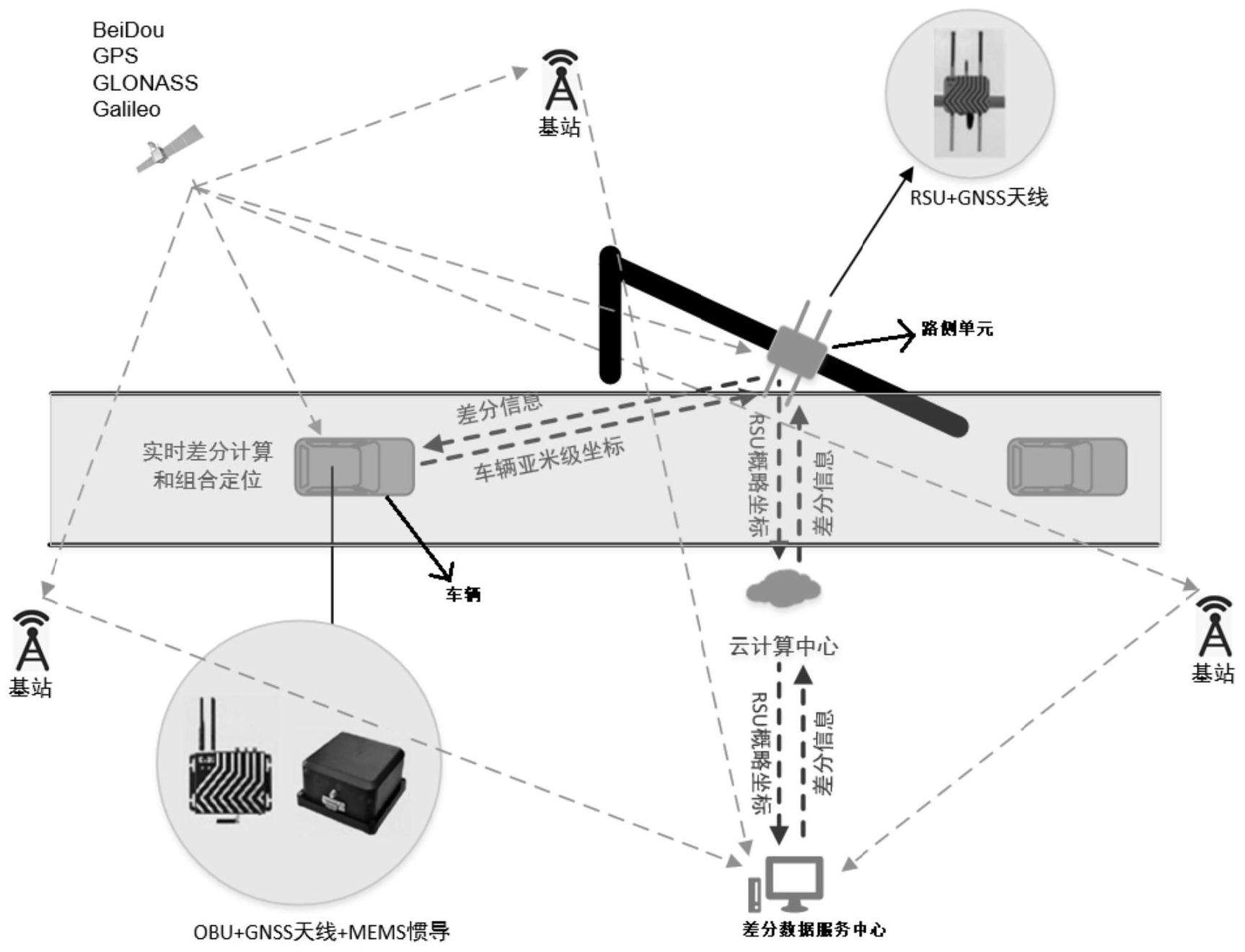 本发明公开了一种基于车路协同的车辆实时定位系统,包括:车载单元、路侧单元、云计算中心;路侧单元用于周期性发送差分数据服务请求至云计算中心;云计算中心,用于验证每个路侧单元的差分数据服务请求,将验证通过的差分数据服务请求转发至差分数据服务中心,获取与该差分数据服务请求对应的差分数据,并将每个差分数据发送至其对应的路侧单元;路侧单元,用于将接收的差分数据发送至预设服务范围内的车载单元;车载单元用于获取惯性导航模块的惯性导航数据、GNSS模块的卫星观测数据,并用于基于差分数据,惯性导航数据及卫星观测数据进行融合计算以实时高精度定位。因此,采用本申请实施例,可以在车辆卫星信号弱的情况下提升车辆的定位精度。