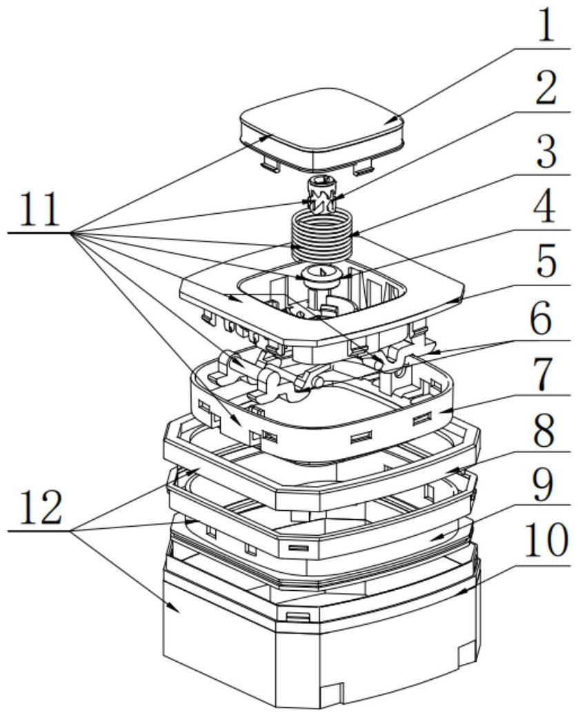 本实用新型公开了一种下变向杠杆形式的按压密封结构,包括方形密封盖和方形密封盖配合部,方形密封盖与方形密封盖配合部装配形成按压密封结构,方形密封盖包括方形按键、中间挂齿件、弹簧、下变向挂齿件、上部密封盖、杠杆插销和下部密封盖,方形密封盖配合部包括上部边沿包覆件、侧边中间连接件和侧边沿包覆件。使用时按下方形按键,中间挂齿件带动下变向挂齿件旋转,下变向挂齿件的挂齿挂在中间挂齿件上,阻止了方形按键在弹簧作用下的上移,从而实现锁紧与密封。本实用新型对市面上的按压结构进行了创新,通过使用下变向形式与杠杆结构来实现密封,同时对结构进行了简化,便于生产与安装,经过实例验证,该密封结构具有极高的可靠性。