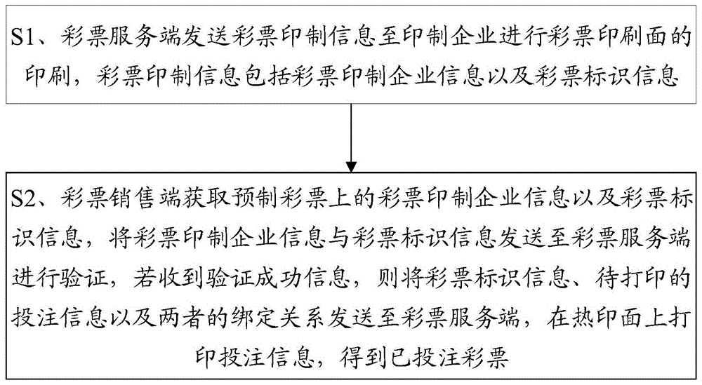 本发明公开了一种彩票的二次防伪方法及系统,彩票服务端发送彩票印制信息至印制企业进行彩票印刷面的印刷,彩票印制信息包括彩票印制企业信息以及彩票标识信息,彩票销售端获取预制彩票上的彩票印制企业信息以及彩票标识信息,将彩票印制企业信息与彩票标识信息发送至彩票服务端进行验证,若收到验证成功信息,则将彩票标识信息、待打印的投注信息以及两者的绑定关系发送至彩票服务端,在热印面上打印投注信息,得到已投注彩票;本发明通过彩票服务端下达彩票印制信息,在进行打印彩票时,对预制彩票上进行初次防伪验证,在后续兑奖时,彩票服务端根据彩票标识信息、投注信息以及两者的绑定关系进行再次防伪验证,实现了对彩票的二次防伪。