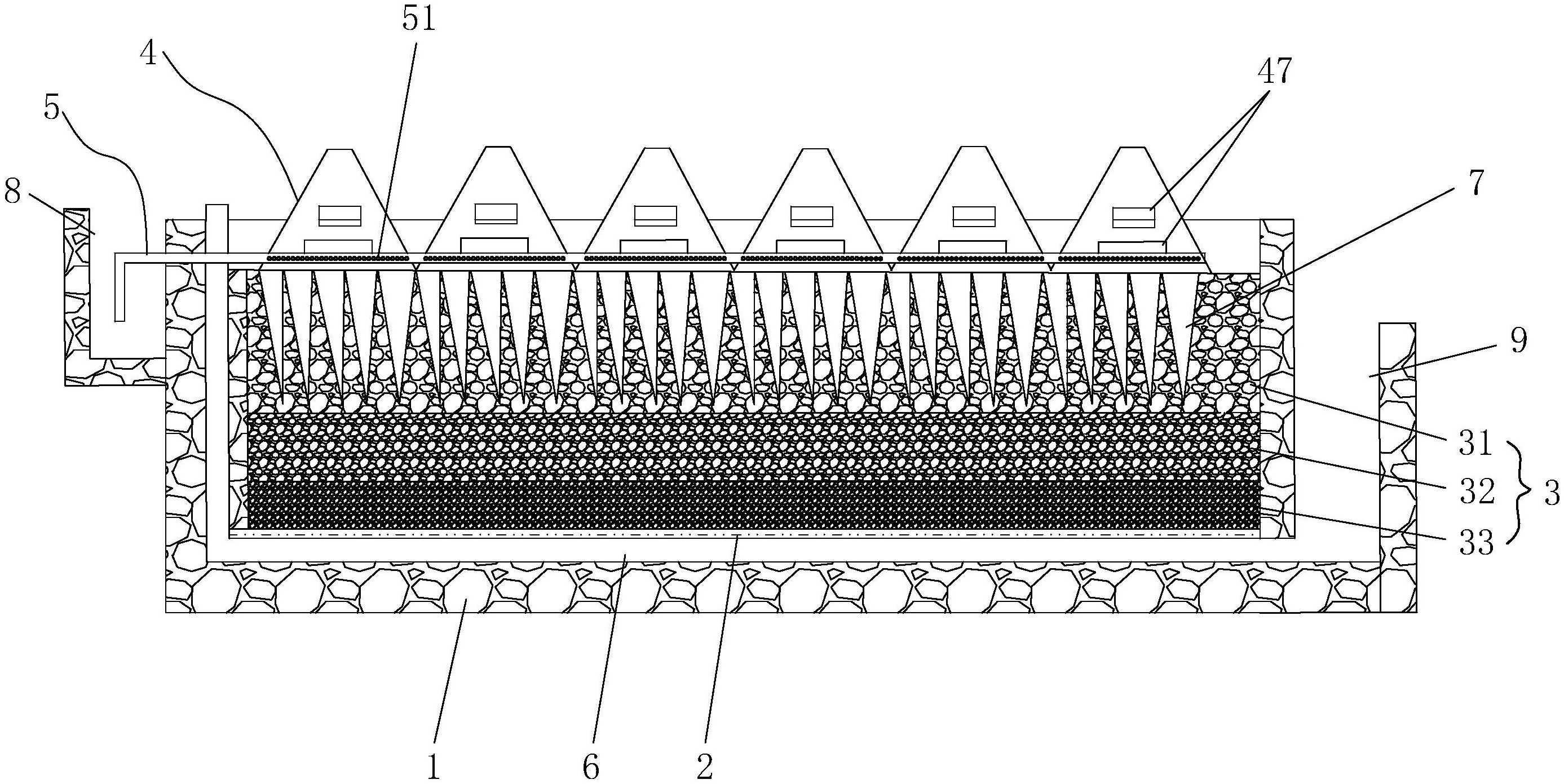 本实用新型公开了一种模块化潜流人工湿地,其特征在于包括池体,所述的池体内设有透水层,所述的透水层上设有净化层,所述的净化层上设有种植装置,所述的种植装置内设有基质层,所述的基质层上种植有植物,所述的池体内设有依次穿过多个所述种植装置的污水进入管,所述的污水进入管上设有多个供污水流入到种植装置内的出水孔,所述的种植装置底部设有多个供植物根部伸入到净化层内并供种植装置吸收后的部分污水流入到净化层净化的网孔结构,所述的池体内还设有承接净化层净化后从透水层渗出的水的出水通道。本实用新型结构简单,拆装方便,植物长势均衡茂盛且净化效果好。