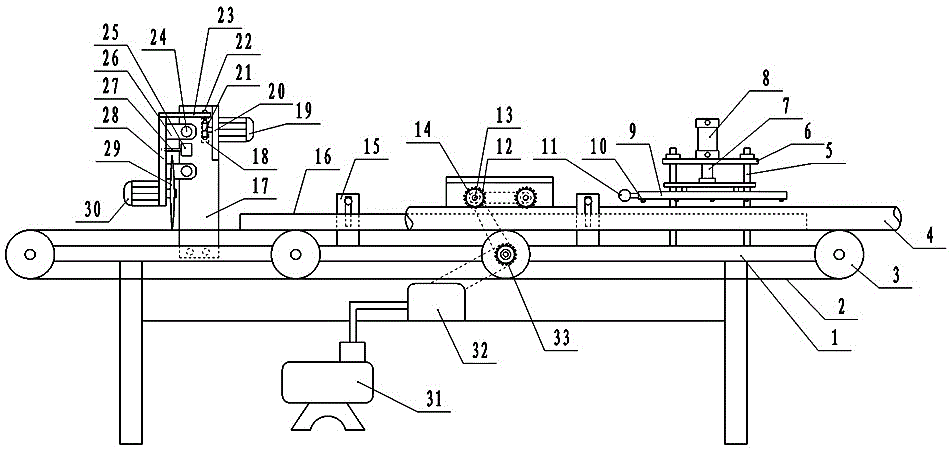 幼苗培养基质灌袋分切机,在机架上安装有输送带,输送带前端安装有基质条带的压紧装置,中部安装有基质条带的步进装置,后端安装有基质条带的切断装置;压紧装置的气缸下安装压管,压管上设有喷头;步进装置的主动齿轮分别与传动箱和从动齿轮用链条连接,从动齿轮安装在齿轮轴一端,齿轮轴上安装有多组步进齿轮;切割装置由支撑板、驱动齿轮、驱动电机、切割架、切割电机和盘形刀片组成。使用时,气泵推动主动齿轮,带动输送带实现步进式输送,压紧装置的气缸推动压管挤压袋内基质,并对基质喷水,驱动电机带动切割架左右移动,切割电机带动盘形刀片高速旋转,将基质条带分切成小段。由于压管对基质进行喷水,基质在切割时不易散落,切割速度较快。