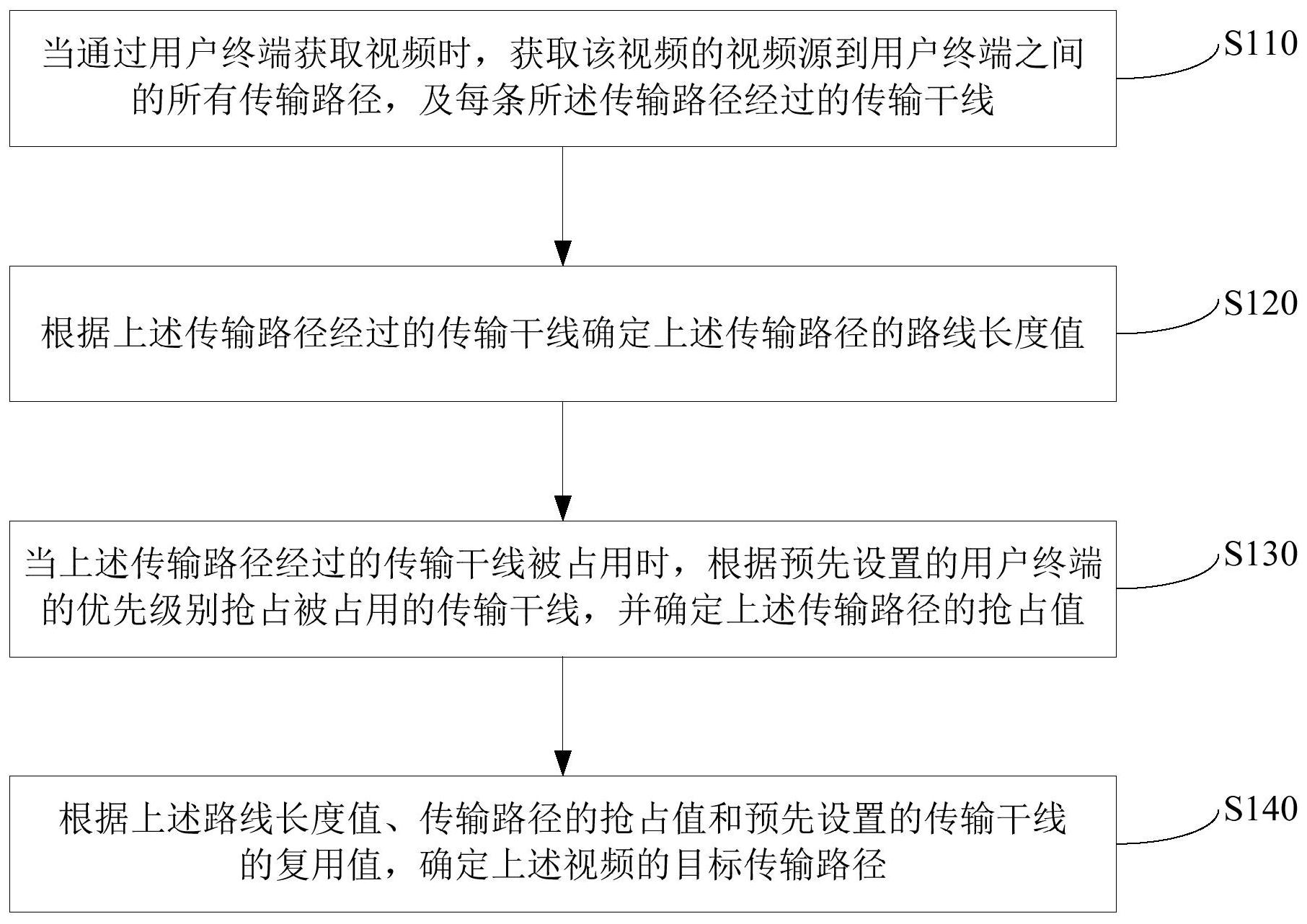本发明提供了一种视频传输路径的确定方法及装置,该方法包括:当通过用户终端获取视频时,获取该视频的视频源到用户终端之间的所有传输路径,及每条传输路径经过的传输干线;根据传输路径经过的传输干线确定传输路径的路线长度值;当传输路径经过的传输干线被占用时,根据预先设置的用户终端的优先级别抢占被占用的传输干线,并确定传输路径的抢占值;根据路线长度值、传输路径的抢占值和预先设置的传输干线的复用值,确定上述视频的目标传输路径。本发明中,根据用户终端的优先级别抢占被占用的传输干线,使得优先级别较高的用户终端能随时打开视频,并且,能够确定出视频的当前最优传输路径,避免由于使用的传输路径不当而导致视频传输延时。