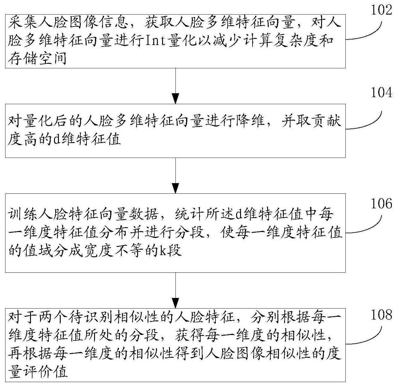 一种用于人脸图像相似性的评价方法和装置,包括:采集人脸图像信息,获取人脸多维特征向量,对人脸多维特征向量进行Int量化;对量化后的人脸多维特征向量进行降维,并取贡献度高的d维特征值;训练人脸图像数据,统计每一维度特征值分布并进行分段,使每一维度特征值的值域分成宽度不等的k段;对于两个待识别相似性的人脸图像特征向量,分别根据每一维度特征值所处的分段,获得每一维度的相似性,再根据每一维度的相似性得到人脸图像向量相似性的评价值。本申请的实施例可以减少系统资源的耗费,快速客观地计算不同人脸图像特征向量的相似性,提高聚类算法的效率与适用性,可实现对人脸特征向量相似性的快速、准确判断。