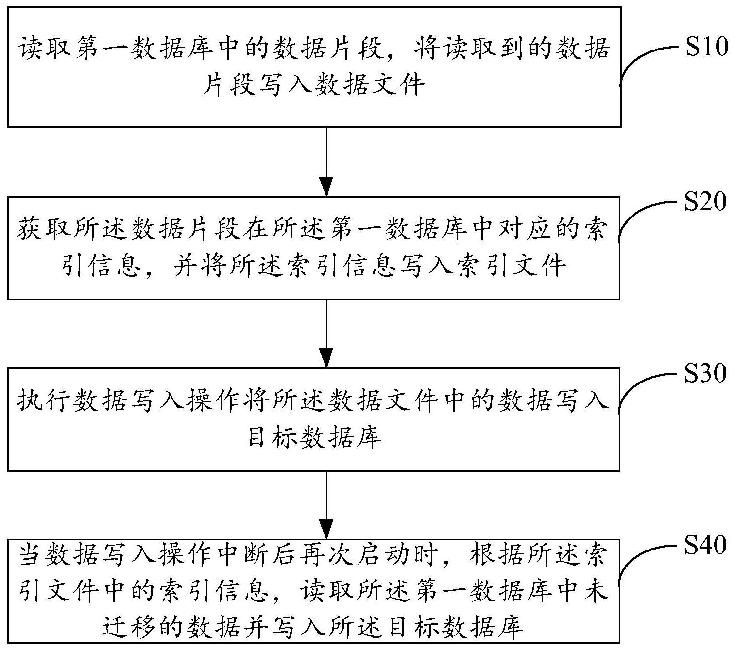 本发明公开了一种数据迁移方法,该方法包括:读取第一数据库中的数据片段,将读取到的数据片段写入数据文件;获取所述数据片段在所述第一数据库中对应的索引信息,并将所述索引信息写入索引文件;执行数据写入操作将所述数据文件中的数据写入目标数据库;当数据写入操作中断后再次启动时,根据所述索引文件中的索引信息,读取所述第一数据库中未迁移的数据并写入所述目标数据库。本发明还公开了一种数据迁移装置和可读存储介质。本发明旨在实现大量数据迁移过程中出现中断后,可基于中断前的数据传输进度继续进行数据传输,减少数据迁移时间,提高发生中断的数据迁移过程的整体传输效率。
