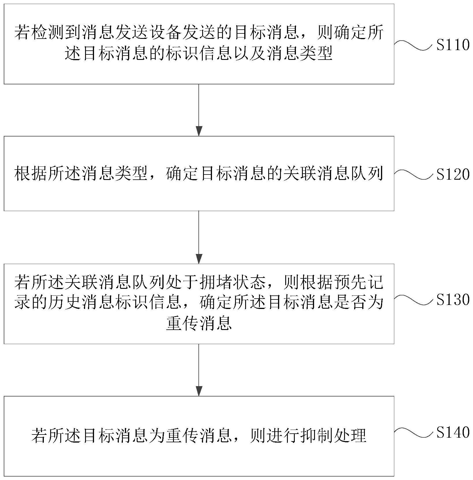 本申请实施例公开了一种系统内的消息处理方法、装置、介质及电子设备。所述方法包括:若检测到消息发送设备发送的目标消息,则确定所述目标消息的标识信息以及消息类型;根据所述消息类型,确定目标消息的关联消息队列;若所述关联消息队列处于拥堵状态,则根据预先记录的历史消息标识信息,确定所述目标消息是否为重传消息;若所述目标消息为重传消息,则进行抑制处理。执行本方案,可以缓解系统内消息拥堵的情况,提高消息响应速度,提高系统的可靠性。