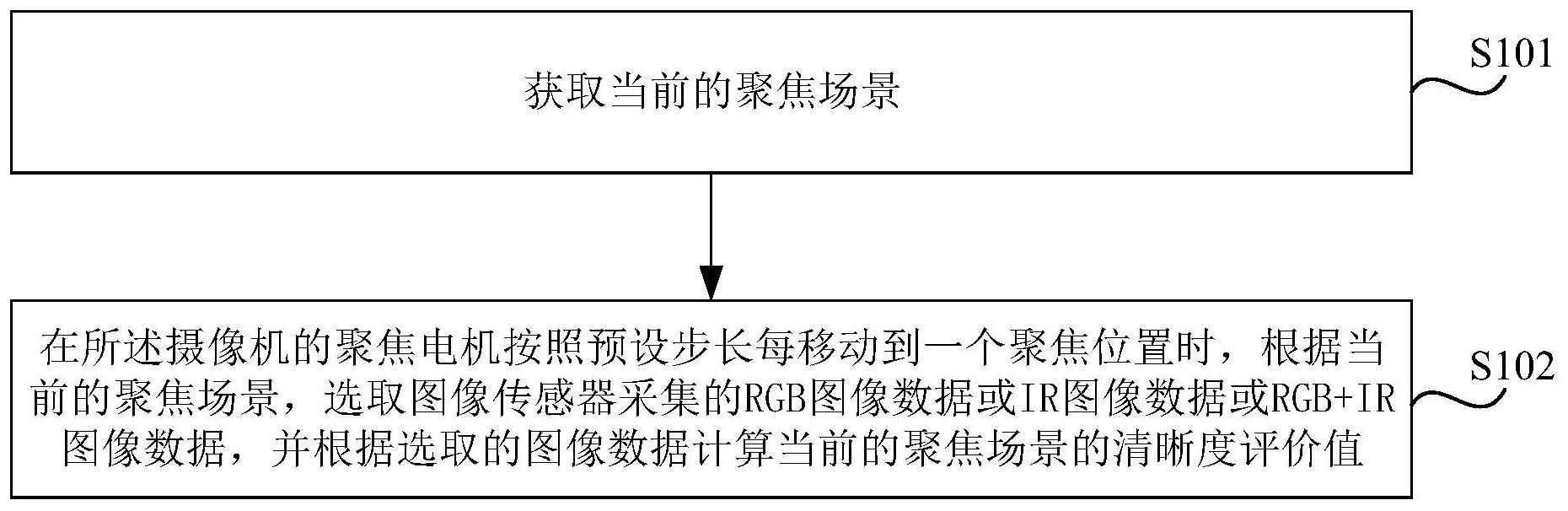 本发明实施例公开了一种清晰度评价值计算方法、装置、摄像机和存储介质。其中,方法包括:获取当前的聚焦场景;在摄像机的聚焦电机按照预设步长每移动到一个聚焦位置时,根据当前的聚焦场景,选取RGB‑IR图像传感器采集的RGB图像数据或IR图像数据或RGB+IR图像数据,并根据选取的图像数据计算当前的聚焦场景的清晰度评价值。本发明实施例通过为不同的聚焦场景选择不同的图像数据来计算清晰度评价值,确保保证了清晰度评价值良好的无偏性、单峰性以及单调性,进而进一步提高了低照下聚焦效果的稳定性和准确度。