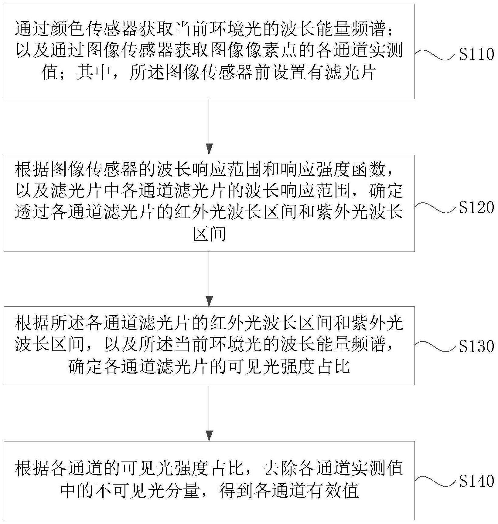 本申请实施例公开了一种不可见光分量的去除方法、装置、存储介质及设备。该方法包括:通过颜色传感器获取当前环境光的波长能量频谱;以及通过图像传感器获取图像像素点的各通道实测值;其中,图像传感器前设置有滤光片;根据图像传感器的波长响应范围和响应强度函数,以及滤光片中各通道滤光片的波长响应范围,确定红外光波长区间和紫外光波长区间;根据红外光波长区间和紫外光波长区间,以及当前环境光的波长能量频谱,确定各通道滤光片的可见光强度占比;去除各通道实测值中的不可见光分量,得到各通道有效值。通过执行本技术方案,可以实现在无需设置不可见光滤光片的前提下,对不可见光造成的影响全部去除,提高了不可见光分量的去除效果。