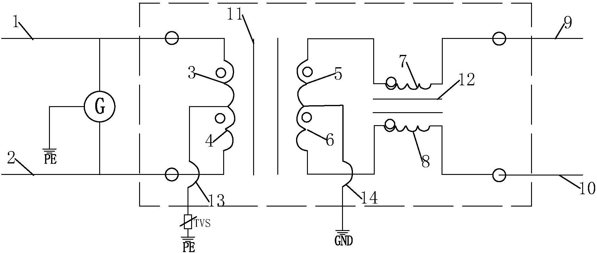 隔离型网络信号浪涌保护器,包括依次串联的第一输入端、第一初级变压器线圈、第二初级变压器线圈及第二输入端,隔离型网络信号浪涌保护器还包括依次串联的第一输出端、第一扼流圈线圈、第一次级变压器线圈、第二次级变压器线圈、第二扼流圈线圈及第二输出端,第一初级变压器线圈及第二初级变压器线圈缠绕在变压器铁芯上,第一扼流圈线圈、第二扼流圈线圈缠绕在扼流圈磁芯上;第一输入端与气体放电管的第一端连接,第二输入端与气体放电管的第二端连接。本实用新型将气体放电管、TVS和隔离模块组合起来,可以通过变压器将第一、第二输入端的差分信号用差模耦合线圈通过电磁转换耦合、滤波到第一、第二输出端,又可以在输入端处泄放浪涌能量。