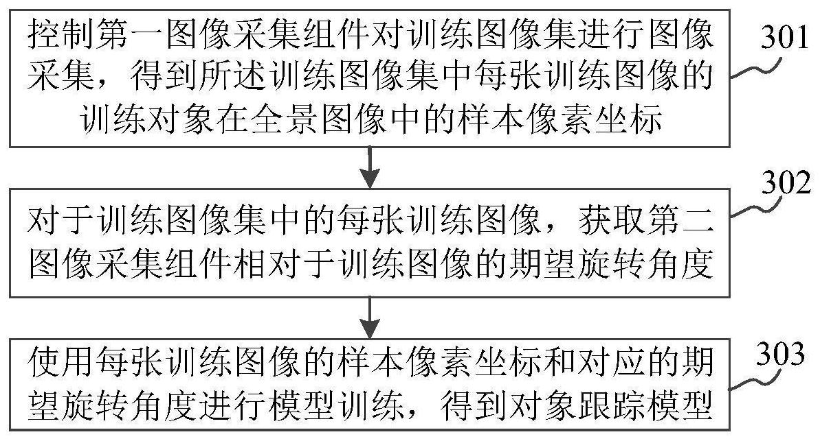 本申请涉及一种对象跟踪模型的训练方法、装置及存储介质,属于计算机技术领域,该方法包括:控制第一图像采集组件对训练图像集进行图像采集,得到训练图像集中每张训练图像的训练对象在全景图像中的样本像素坐标;对于训练图像集中的每张训练图像,获取第二图像采集组件相对于训练图像的期望旋转角度;使用每张训练图像的样本像素坐标和对应的期望旋转角度进行模型训练,得到对象跟踪模型;可以解决同一型号对象跟踪设备由于生产过程中不可避免地存在随机误差,导致跟踪拍摄对象的跟踪精度较低的问题;可以使用个性化地训练得到的对象跟踪模型进行对象跟踪,从而提高对象跟踪精度。且由于训练过程完全自动化,因此,可以提高模型训练效率。