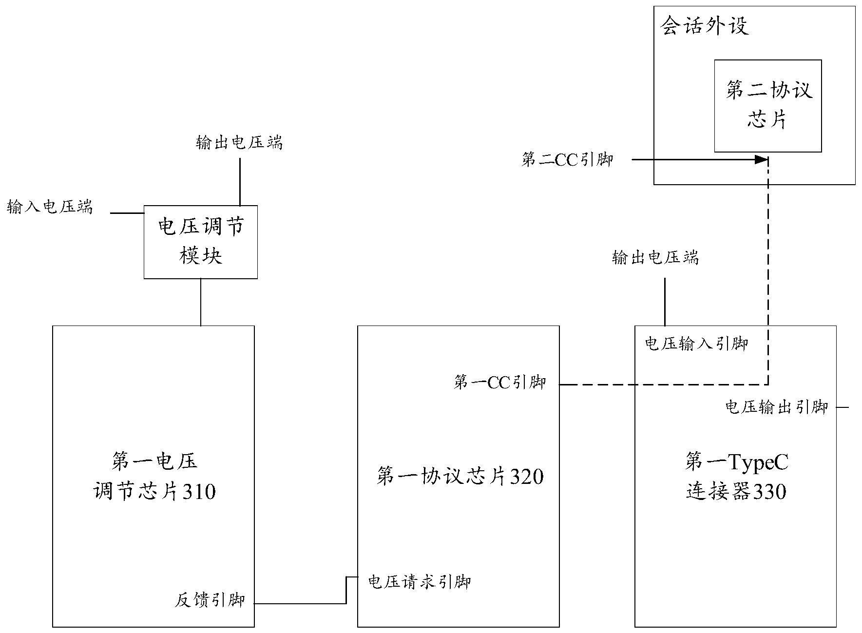 本申请包括一种会话终端电路、会话外设电路及会话系统,具体涉及视频会话技术领域。会话终端电路包括第一电压调节电路、第一协议芯片、第一Type C连接器;第一协议芯片通过第一CC引脚与会话外设电路中的第二协议芯片的第二CC引脚实现电连接,以获取第二协议芯片的电压调节请求;第一协议芯片将电压调节请求转发至第一电压调节电路,第一电压调节电路根据电压调节请求进行电压调节并通过输出电压端输出调节后的电压;第一Type C连接器获取调节后的电压并通过电压输出引脚将调节后的电压传输至会话外设电路。上述方案中协议芯片以及Type C连接器可以直接实现将电压传输至外设电路,不需要添加网络变压器、限流电路等模块,降低了产品的资源消耗。