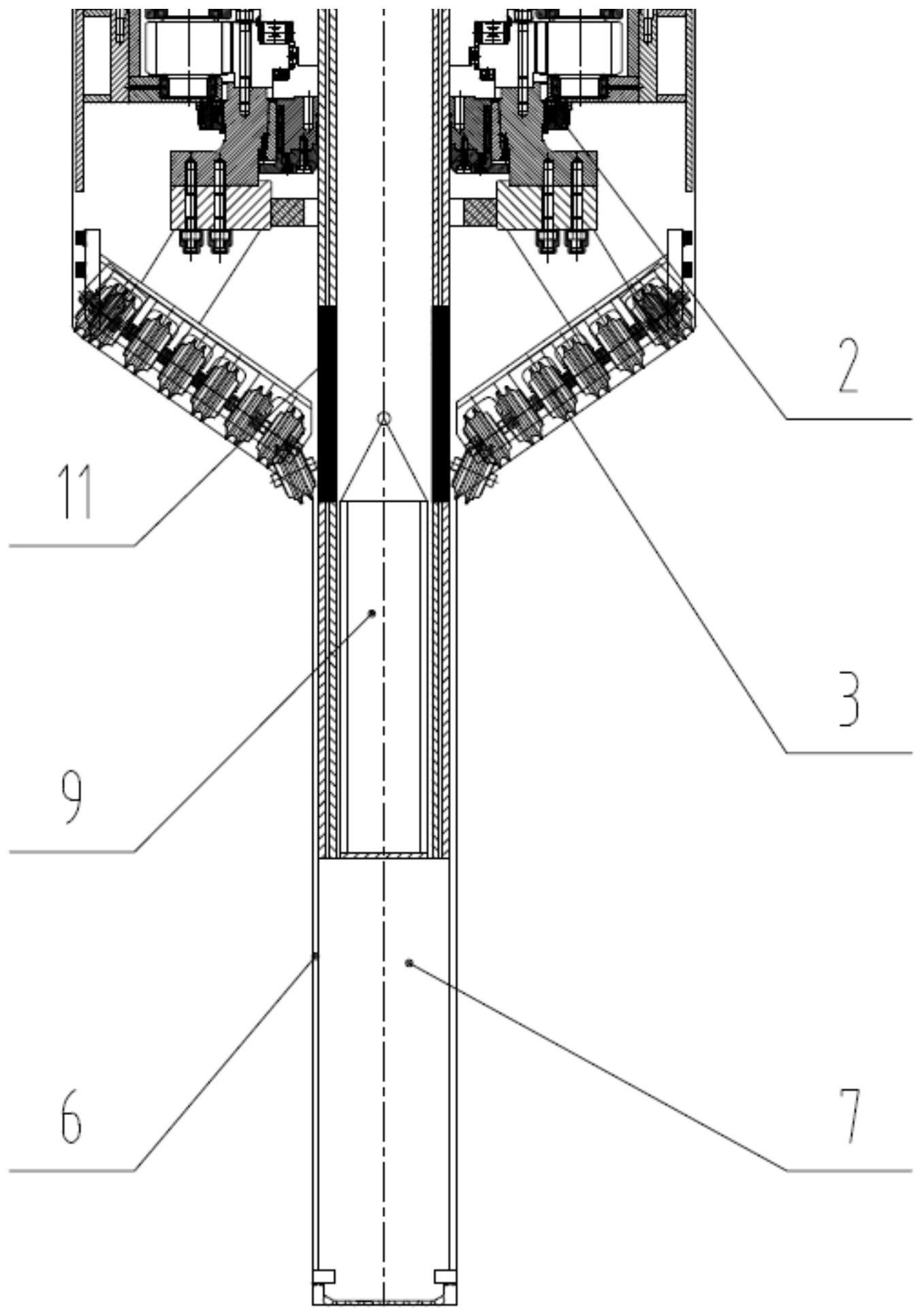 本发明公开了一种竖井掘进机,包括:主驱动、刀盘、潜孔锤、潜孔锤外筒、出渣吊桶和空气系统,出渣吊桶设于潜孔锤的内部,出渣吊桶可沿潜孔锤的轴向移动;潜孔锤外筒套设于潜孔锤的外侧,潜孔锤外筒设有可开启和关闭的闸门,刀盘套设于潜孔锤外筒的外侧、且位于闸门的位置处;当先导开挖时,闸门关闭,主驱动驱动潜孔锤以第一速度旋转,且潜孔锤向前掘进,通过空气系统向潜孔锤的内部输送高压空气,以使潜孔锤挖出的渣土被吹至出渣吊桶中;当扩挖时,闸门开启,主驱动驱动刀盘以第二速度旋转,且刀盘向前掘进,第一速度大于第二速度;刀盘扩挖出的渣土经过闸门后掉落至出渣吊桶中。上述竖井掘进机,竖井的挖掘深度较深,自动化程度高,结构简单。